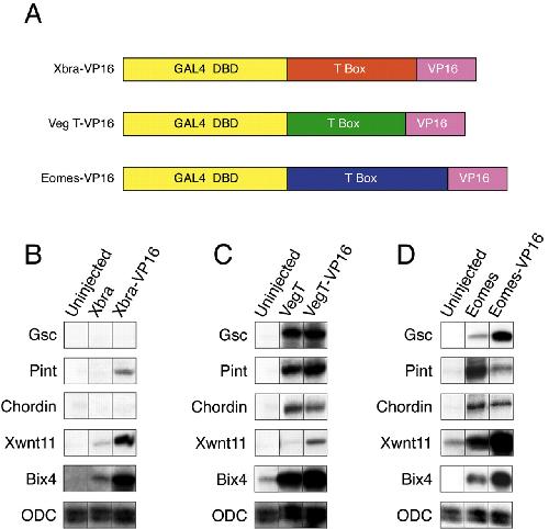 Xbra, VegT and Eomesodermin specificity resides mainly in the T box. (A) Chimeric proteins comprising the T boxes of Xbra, VegT and Eomesodermin fused to the GAL4 DNA-binding domain and the VP16 activation domain. Proteins were expressed in early Xenopus embryos and their abilities to activate gene expression were assessed by RNAase protection. (B) Xbra and Xbra-VP16. (C) VegT and VegT-VP16. (D) Eomesodermin and Eomesodermin-VP16. Note that the inductive abilities of the chimeric constructs resemble those of the parent molecule. |