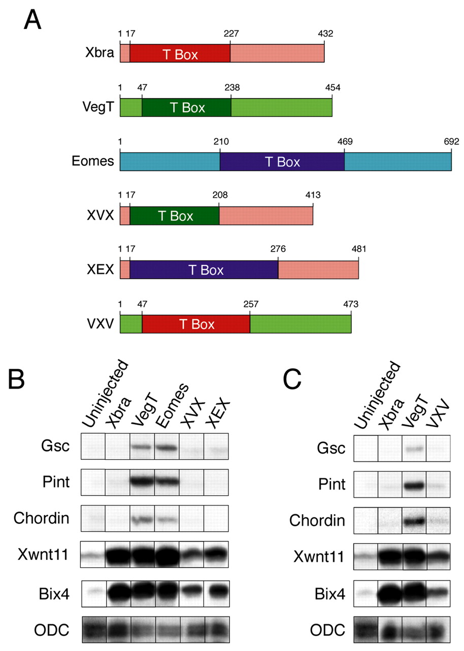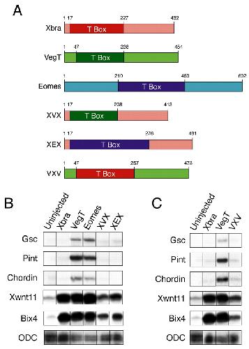 Sequences outside the Xbra T box restrict induction by VegT and Eomesodermin. (A) The parent Xbra, VegT and Eomesodermin proteins, and chimeric versions thereof. XVX consists of the VegT T box surrounded by Xbra non-T box sequences; XEX contains the Eomesodermin T box surrounded by Xbra non-T box sequences; and VXV consists of the Xbra T box surrounded by VegT non-T box sequences. (B) Activation of Goosecoid, Pintallavis and Chordin by XVX and XEX is lower than activation of the same genes by the parent proteins, suggesting that the non-T box sequences of Xbra reduce levels of induction. (C) Goosecoid, Pintallavis and Chordin are not induced by a protein comprising the Xbra T box surrounded by VegT non-T box sequences. |
