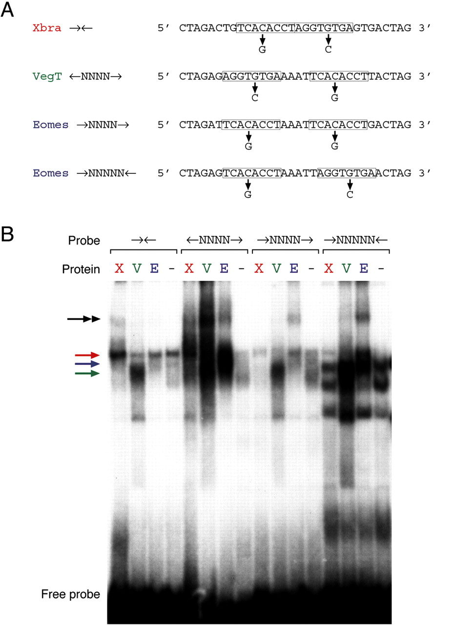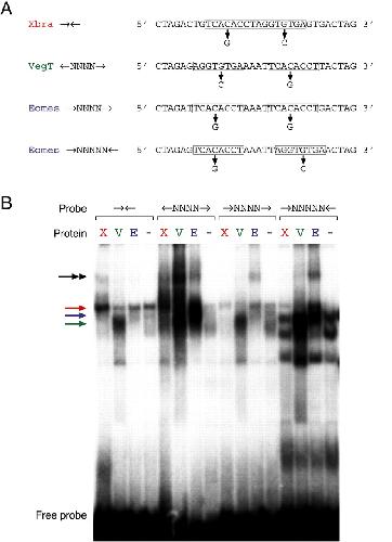 Electrophoretic mobility gel shift assays demonstrate differences between different T box proteins to interact with different oligonucleotides. (A) Oligonucleotides used in electrophoretic gel mobility shift assays. Only one strand is shown and core motifs are boxed. Arrows indicate mutations in control oligonucleotides. Use of these oligonucleotides in electrophoretic gel mobility shift assays prevented binding (data not shown). (B) Band shift assay. Single-headed arrows indicate positions of high mobility complexes (red, Xbra; green: VegT, blue: Eomesodermin). Double-headed arrow indicates low mobility complexes. |