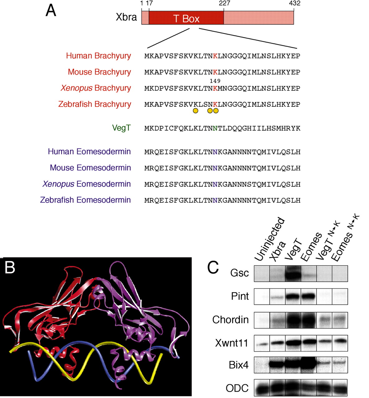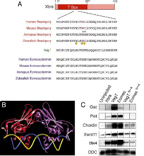 Identification of lysine 149 as an amino acid which may confer T box specificity. (A) Diagram of Xbra and part of the T box sequences of human, mouse, Xenopus and zebrafish Brachyury. Yellow circles indicate amino acids which contact DNA (Muller and Herrmann, 1997). The sequences are aligned with the equivalent regions of Xenopus VegT and human, mouse, Xenopus and zebrafish Eomesodermin. Note that the K residue in Xbra is replaced by an N in VegT and Eomesodermin. (B) Asterisk (on the left-hand T box) marks the position of K149 on the crystal structure of the Xbra T box bound to DNA (Muller and Herrmann, 1997). (C) Mutation of an asparagine residue in VegT and Eomesodermin to lysine causes those proteins to resemble Xbra in their inducing activities; VegTNâK and EomesoderminNâK lose the ability to induce Goosecoid and levels of Chordin and Pintallavis are significantly reduced. |