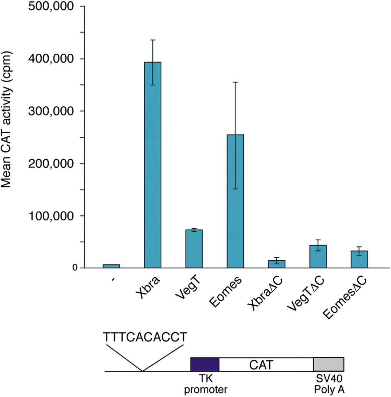 Xbra, VegT and Eomesodermin can function as transcriptional activators. Expression constructs encoding Xbra, VegT or Eomesodermin, or truncated versions of the proteins (see Materials and Methods), were transfected into 3T3 cells along with a reporter plasmid in which the sequence TTTCACACCT is placed upstream of a minimal promoter (below). All three T box proteins activated transcription, and activation was reduced in the truncated versions. |
