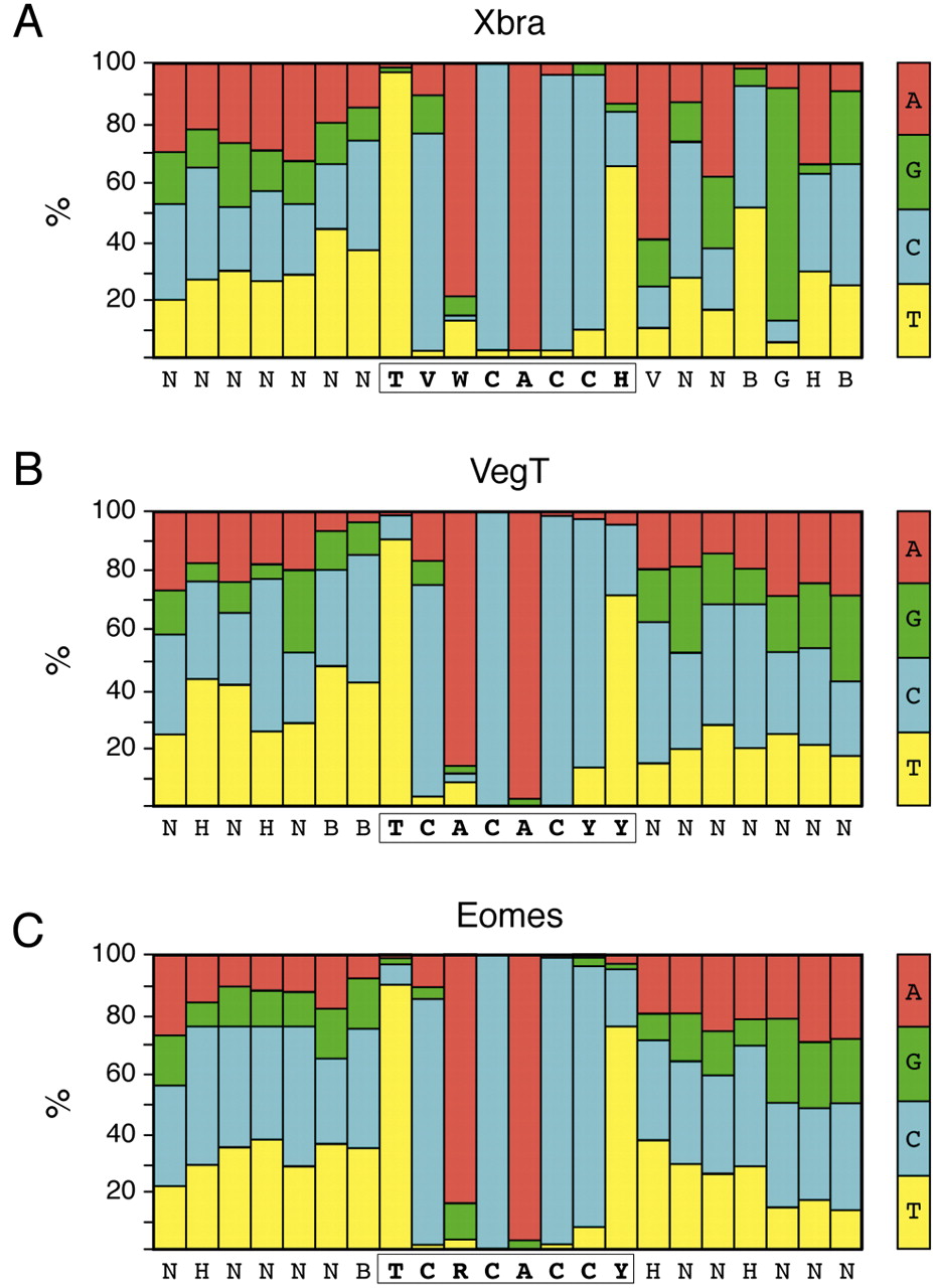 Motifs selected by Xbra (A), VegT (B) and Eomesodermin (C) after five rounds of binding site selection. The consensus sequence is represented at the bottom of each histogram; if a nucleotide is present in greater than 10% of the selected sequences it is defined as being part of the consensus, and in this respect the sites selected by the three proteins differ. However, the core motif selected by all three T box proteins is clearly TCACACCT, and we have been unable to define sequences that are specific for a single member of the family. Note that Xbra shows a preference for a G positioned 5 nucleotides downstream of the core motif; see text for further details. |