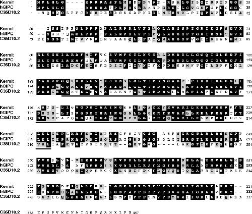 Sequence of Kermit. Deduced amino acid sequences from Kermit, human GIPC and C. elegans gene C35D10.2 were aligned using MacVector 6.0 ClustalW alignment. Identical amino acids are in black boxes and similar amino acids are in gray. The PDZ domain is underlined. Kermit sequence has been deposited into the GenBank database under Accession Number AF215838. |
