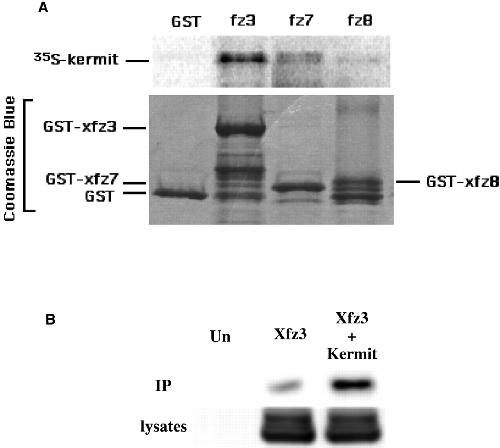 Kermit interacts with Xfzs in vitro and in Xenopus embryos. (A) In vitro binding: Xfz3, Xfz7 and Xfz8 C-termini purified as GST-fusion proteins were incubated with 35S-labeled Kermit (in vitro translated). Autoradiography (top panel) shows that Kermit bound strongly to the Xfz3 C terminus and weakly to Xfz7, but not to Xfz8. The lower panel shows Coomassie Brilliant Blue staining of the GST fusion proteins. (B) Co-immunoprecipitation of Kermit and Xfz3. Embryos were injected at the one-cell stage with mRNAs encoding Xfz3 and Myc-tagged Kermit, and cultured until the late blastula stage. Xfz3/Kermit complexes were immunoprecipitated from embryo lysates with anti-Myc antibody and Xfz3 was visualized by Western blotting. |