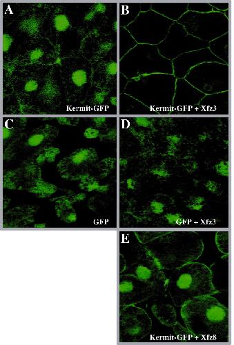 Xfz3 causes Kermit membrane translocation. Kermit-GFP or control GFP mRNA were injected into animal poles with Xfz3 or Xfz8 mRNA at the one-cell stage. Animal caps were dissected at stage 8, fixed and analyzed by confocal microscopy. (A) Kermit-GFP is localized to both cytoplasm and nucleus, similar to the GFP control (compare A with C). (B) Expression of Xfz3 causes a marked translocation of Kermit to the plasma membrane, with little remaining in the nucleus or cytoplasm. (C) Control expression of GFP, with localization in cytoplasm and nucleus. (D) Xfz3 expression has no effect on the distribution of GFP alone. (E) Xfz8 has only a small effect on Kermit subcellular distribution (compare A with E). |