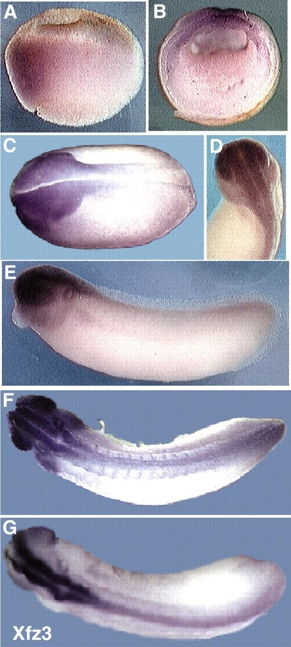 Fig. 3. Spatial pattern of Kermit expression. In situ hybridization was performed at early gastrula, early and late neurula, and tadpoles stages. (A) A stage 10+ gastrula, with the dorsal lip visible in the lower left. (B) A hemisection of a stage 14 neurulae, with dorsal oriented upwards; diffuse staining is visible in the neural plate, notochord, and paraxial mesoderm. (C) Strong staining in the anterior neural plate of a stage 18 neurula (anterior is towards the left). (D,E) Stage 26 and (F) stage 32 tadpoles, with kermit expression in the neural tube, eye, otic vesicle and branchial arches. (G) Expression of Xfz3 in a stage 32 tadpole. |