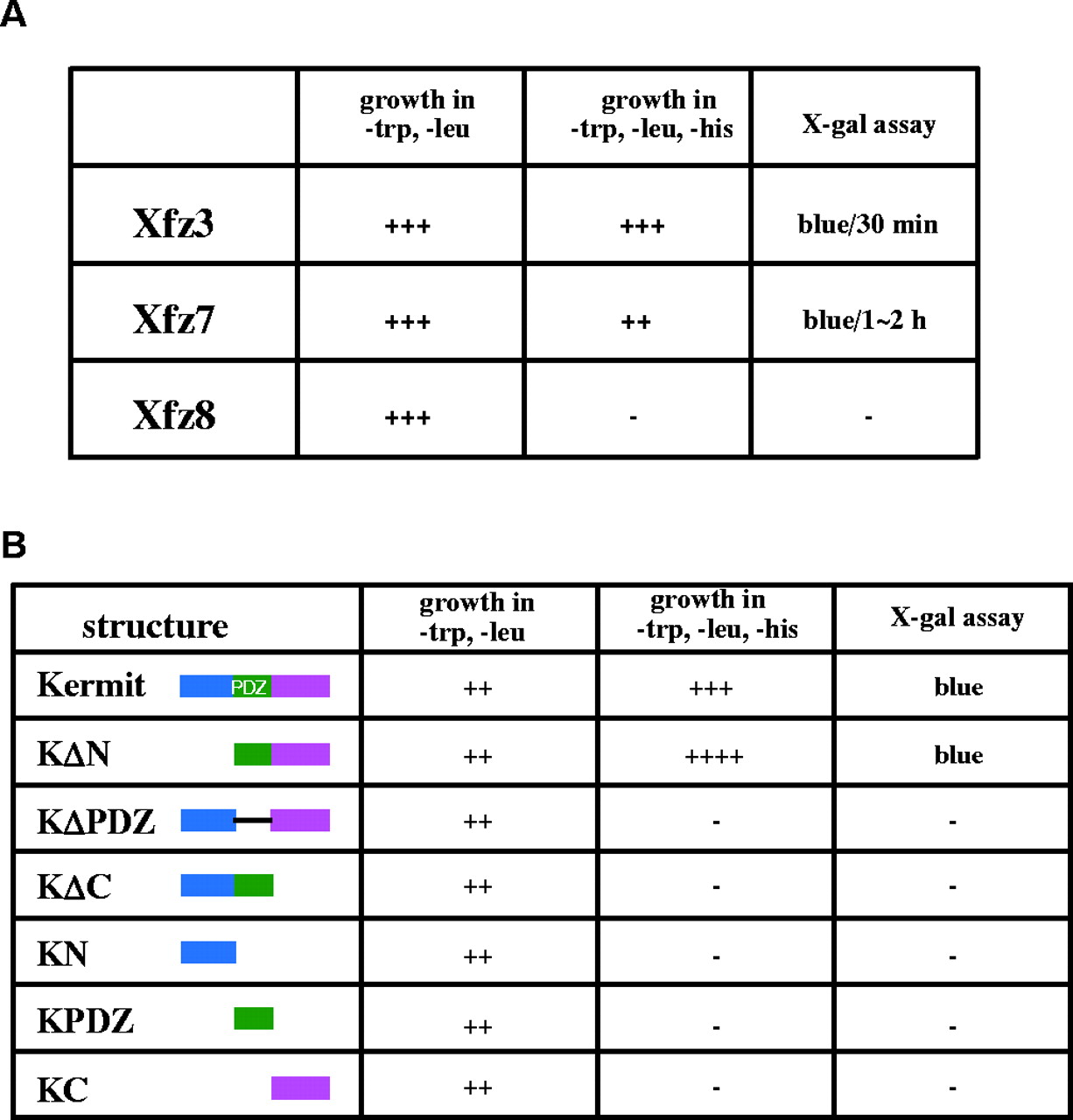 Interaction of Kermit with the C termini of Xfzs in yeast two hybrid assays. Yeast strain Y190 was transformed with Kermit or Kermit mutants and Xfz3, Xfz7 or Xfz8, plated on either nonselective medium (-trp, -leu) or selective medium (-trp, -leu, -his). Growth was checked 3 to 4 days later, and the hydrolysis of X-gal was monitored on filter lifts from all plates. Plus signs indicate size of colonies; minus sign indicates no growth (in left and middle columns) or no X-gal hydrolysis (right column). (A) Interaction of Kermit with the C termini of Xfz3, Xfz7 and Xfz8. (B) Domain requirement of Kermit in interaction with Xfz3. Blue, N terminus (amino acids 1-127); green, PDZ domain (amino acids 128-217); purple, C terminus (amino acid 218-331). |