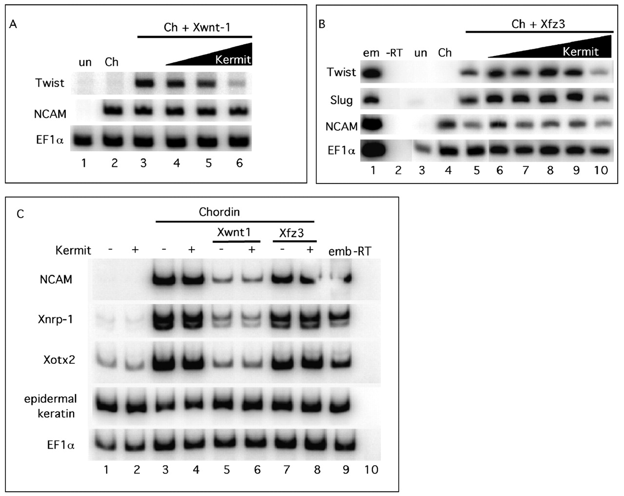 Overexpression of Kermit inhibits neural crest induction by Xwnt1 and Xfz3. mRNAs for chordin, Xwnt1 or Xfz3, and Kermit were injected into the animal pole of fertilized eggs. (A,B) Animal caps were dissected when embryos reached stage 8-9 and RNA was harvested at stage 18 for RT-PCR analysis using primers for Xtwist, Xslug, NCAM or EF-1α (as described in the Materials and Methods). (A) Kermit (0.12, 0.25 or 0.5 ng of Kermit mRNA) inhibits Xwnt1-dependent induction of the neural crest marker Xtwist in a dose-dependent manner. Xslug expression was also inhibited (not shown). (B) Kermit (0.004, 0.016, 0.06, 0.25 or 1.0 ng of Kermit mRNA) inhibits Xslug and Xtwist induction by Xfz3. EF-1α was used as a loading control. (C) Kermit does not affect expression of neural markers NCAM, Nrp1 and Xotx2, or of the epidermal marker keratin. Fertilized eggs were injected with mRNA for chordin (0.1 ng), Xwnt1 (0.1 pg), Xfz3 (0.13 ng) and kermit (1.0 ng), as indicated in the figure; animal caps were explanted at stage 8-9 and harvested at stage 25 for RT-PCR, as above. |