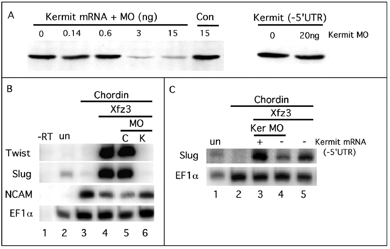 Kermit is required for neural crest induction by Xfz3. (A) Kermit morpholino antisense oligonucleotide (MO) directed against the 5â²UTR of Kermit mRNA blocks translation of Kermit protein. Kermit mRNA was injected into embryos with increasing concentrations of Kermit MO or control MO and embryo lysates were analyzed by western blotting with anti-NIP antibodies (which crossreact with overexpressed Kermit). Translation of Kermit mRNA lacking the 5â²UTR was not inhibited by the Kermit MO (20 ng MO; right panel). (B) Depletion of Kermit with antisense MO (4 ng; lane 6) reduces or eliminates neural crest induction by Xfz3 (lanes 4 and 6). Neural crest induction and RT-PCR were performed as in figure 7. Lane 1 is a no reverse transcriptase control; lane 2 shows uninjected control caps (un); lane 3 shows samples expressing chordin alone; lane 4 shows induction of neural crest makers by Xfz3 + chordin; lane 5 shows Xfz3 + chordin + control MO (C); and lane 6 shows Xfz3 + chordin + Kermit-MO (K). (C) Kermit mRNA lacking the 5â²UTR rescues inhibition by Kermit MO. Neural crest induction assay was performed as above. Kermit MO (4 ng) was injected (lanes 3, 4) with (+) or without (â) Kermit mRNA (10 pg) lacking the 5â²UTR. |