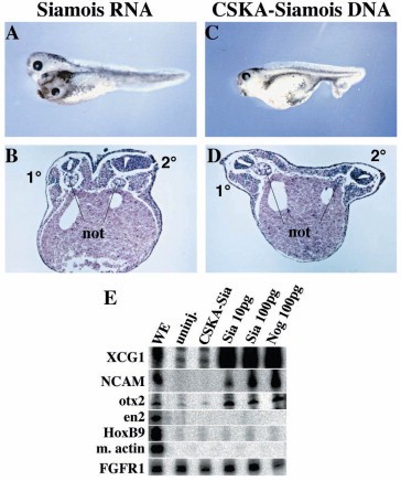 Fig. 1. Late blastula expression of Siamois is not sufficient to promote anterior development. (A,B) Embryos were injected at the four-cell stage with 20 pg/blastomere (bl) Siamois mRNA. (C,D) Embryos were injected at the four-cell stage with 100 pg/bl CSKA-Siamois plasmid DNA. In (B,D), cross-sections were counterstained with hematoxylin/eosin. Note that embryos injected with CSKA-Siamois plasmid DNA did not develop a head (100% of negative cases) but occasionally developed a notochord (50% of positive cases). (E) RNAse protection analysis of animal explants injected with the indicated amount of RNAs or 100 pg/bl CSKA-Siamois plasmid DNA at the two-cell stage. Animal caps (20 per probe) were dissected at stage 9 and incubated up to stage 28. The absence of mesoderm in the explants was assessed by the lack of muscle actin specific signal. FGFR1 expression served as a loading control. Siamois RNA but not DNA induced the anterior markers XCG1 (cement gland) and otx2 (forebrain/midbrain) as well as the neural cell adhesion marker N-CAM in a manner comparable to the neural inducer noggin (Nog). Siamois did not induce the en2 (midbrain/hindbrain boundary) and Hoxb9 (spinal cord) markers.