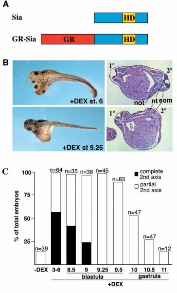 Fig. 2. Time-window of competence to respond to Siamois. (A) Schematic representation of the GR-Sia expression construct. (B) Embryos were injected ventrally with 50 pg/bl GR-Sia mRNA at the four-cell stage, and DEX (10 mM) was added at stage 6 (32-cell) or stage 9.25, and embryos allowed to develop to tadpoles (left). Note that induction of Siamois activity from stage 9.25 was not sufficient to allow for head formation. Hematoxylinâeosin staining on cross-sections revealed the formation of a full set of duplicated dorsal structures including a notochord in embryos treated with DEX at stage 6 (6/6), while embryos treated at stage 9.25 typically lacked a notochord in the secondary axis (11/12) (right). (C) Bar graph showing a compilation of three independent experiments where the activity of GR-Sia is represented as a function of time of addition of DEX. Duplicated axes were scored complete when they showed a cement gland and at least one eye. Note that head induction did not occur past stage 9 of the blastula, while trunk duplication was still pronounced 2-h later, at the onset of gastrulation (stage 10). n = total number of injected embryos.