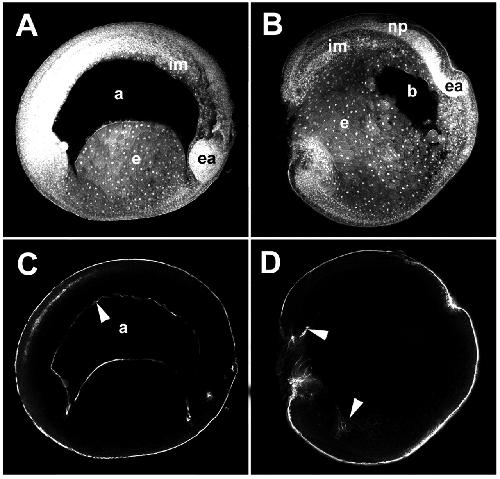 Fig. 7. FN is required for archenteron formation. Embryos are arranged with anterior to the right. (A,B) Confocal sections of stage 17 embryos collected on the red channel, showing dextran labeling in all cells in the embryo. (C,D) The same sections as in A and B collected on the green channel to reveal biotin-labeled cells detected with fluorescein tyramide. (A) Embryos injected at stage 9.5 with mAb 4H2 go on to develop normal neurula with an enlarged archenteron (a). Involuted mesoderm (im) is differentiating and endoderm (e) is contained ventrally. The eye anlage (ea) has begun to differentiate. (C) Biotin labeling of cell surface at stage 9 reveals that the archenteron lining is derived from cells that were previously at the surface of the embryo (arrowhead). (B) Embryos injected with mAb 1F7 have a short AP axis, the archenteron fails to form and the blastocoel (b) is retained. The neural plate has formed (np) and the eye anlage (ea) is evident. The endoderm (e) is not ventrally contained and the involuted mesoderm (im) is disorganized. Biotin labeling reveals that few surface-labeled cells involute inside the embryo (D; arrowheads). |