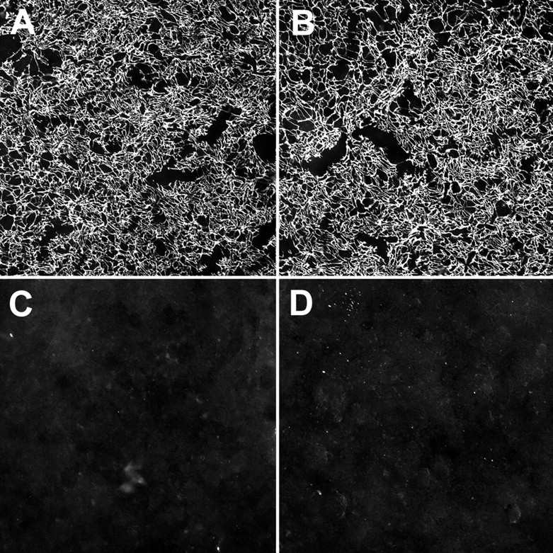 Fig. 1. Anti-FN mAbs inhibit matrix assembly in vivo. Embryos were injected with a mouse mAb and FN detected with an anti-FN rabbit polyclonal. (A) BCR of stage 11.5 sham-injected embryo showing normal FN fibril formation. (B) BCR of sibling embryo injected with the non-blocking anti-FN mAb 4H2. (C) Injection of mAb 1F7 directed against the synergy site of FN inhibits BCR matrix assembly at stage 11.5. (D) mAb 4B12 directed against the RGD-containing central cell-binding domain of FN. |
