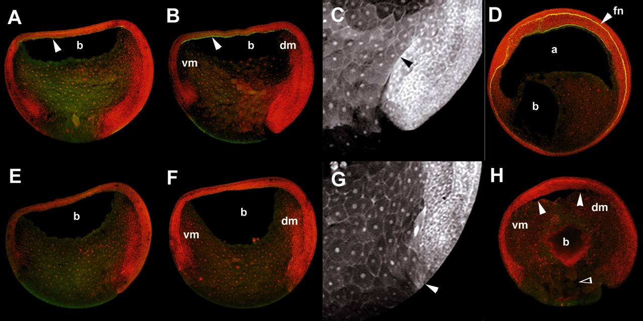Fig. 3. Sagittal sections of gastrula stage embryos. In all panels embryos are arranged with the dorsal lip towards the right. MAb 4H2- (A-D) and mAb 1F7-injected (E-H) embryos were optically sectioned by confocal microscopy. Dextran (red) is used for contrast enhancement as described in the methods. FN is detected with a rabbit polyclonal Ab (green). The intracellular green fluorescence observed in endoderm and mesoderm cells results from autofluorescence and does not represent FN localization. Stage 10.5 mAb 4H2-(A) and mAb 1F7-injected (E) embryos look similar. FN accumulates along the BCR in mAb 4H2-injected embryos (A, arrowhead) and does not accumulate in embryos injected with mAb 1F7 (E). (B) Stage 11 embryos injected with mAb 4H2: displacement of involuted mesoderm is greater along the dorsal side of the embryo (dm). (F) Stage 11 mAb 1F7-injected embryos show an equal displacement of dorsal (dm) and ventral (vm) mesoderm. (C) Archenteron formation in mAb 4H2-injected embryo is evident by stage 11 (arrowhead). (G) Bottle cells (arrowhead) remain on the surface of stage 11 mAb 1F7-injected embryos and no archenteron is evident. (D) By stage 12, mAb 4H2-injected embryos exhibit a closed blastopore and an inflated archenteron (a). The blastocoel (b) is almost eliminated, and mesoderm has begun to differentiate. A pronounced FN matrix (fn) is evident (D, arrowhead). Gastrula injected with mAb 1F7 shows misplaced mesoderm that is not adherent to the BCR (H, arrows). The BCR has thickened and the marginal zones remain thick. No archenteron is present and a centralized remnant of the blastocoel remains. The blastopore remains open and tissue in the yolk plug appears dissociated (H, open arrow). a, archenteron; b, blastocoel; bcr, blastocoel roof; dm, dorsal mesoderm; fn, fibronectin matrix; vm, ventral mesoderm. QuickTime movies of blastopore closure of control and mAb injected embryos may be viewed on the DeSimone laboratory website (http://faculty.virginia.edu/desimonelab). |