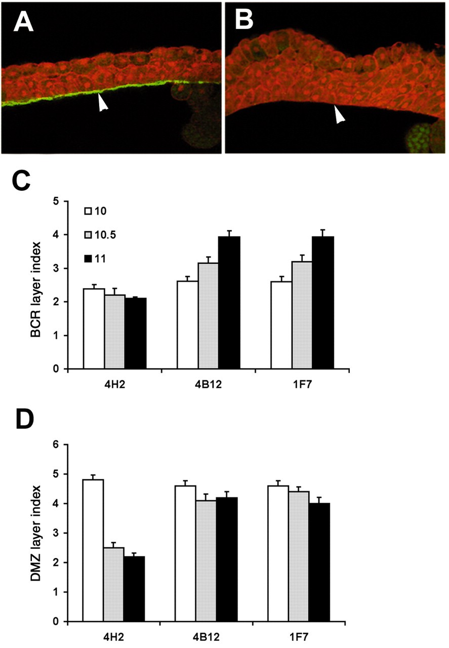 Fig. 4. FN is required for BCR and DMZ thinning. Blastocoelar injection of mAbs was performed at stage 9.5. (A) Confocal section of the BCR of mAb 4H2-injected dextran-labeled embryo at stage 11. The FN matrix lining the blastocoel is shown (arrowhead). There is only a single layer of deep cells (layer index=2). (B) mAb 1F7-injected dextran labeled embryos at stage 11. No FN matrix is evident (arrowhead) and the BCR has multiple layers of deep cells. (C) BCR layer index of mAb-injected embryos. MAb 4H2-injected embryos (controls) show a decrease in BCR layer index from 2.3 at stage 10 to 2 by stage 11. In mAb 4B12-injected embryos, the BCR shows an increase in BCR layer index from 2.4 at stage 10 to almost 3.9 by stage 11. Similarly, in mAb 1F7-injected embryos the layer index increases from 2.4 at stage 10 to 3.9 at stage 11. (D) DMZ layer index does not decrease in blocking mAb-injected embryos. In mAb 4H2-injected embryos (controls) the DMZ layer index decreases from 4.9 at stage 10 to 2.2 at stage 11. In mAb 4B12-injected embryos, the layer index at stage 10 is 4.8 and this decreases to 4.6 by stage 11. In mAb 1F7-injected embryos the layer index at stage 10 is 4.8 and this decreases to 4.2 by stage 11. The minimum number of cells spanning the BCR in the radial direction was counted (layer index) at stages 10 (white bars), 10.5 (gray bars) and 11 (black bars). |