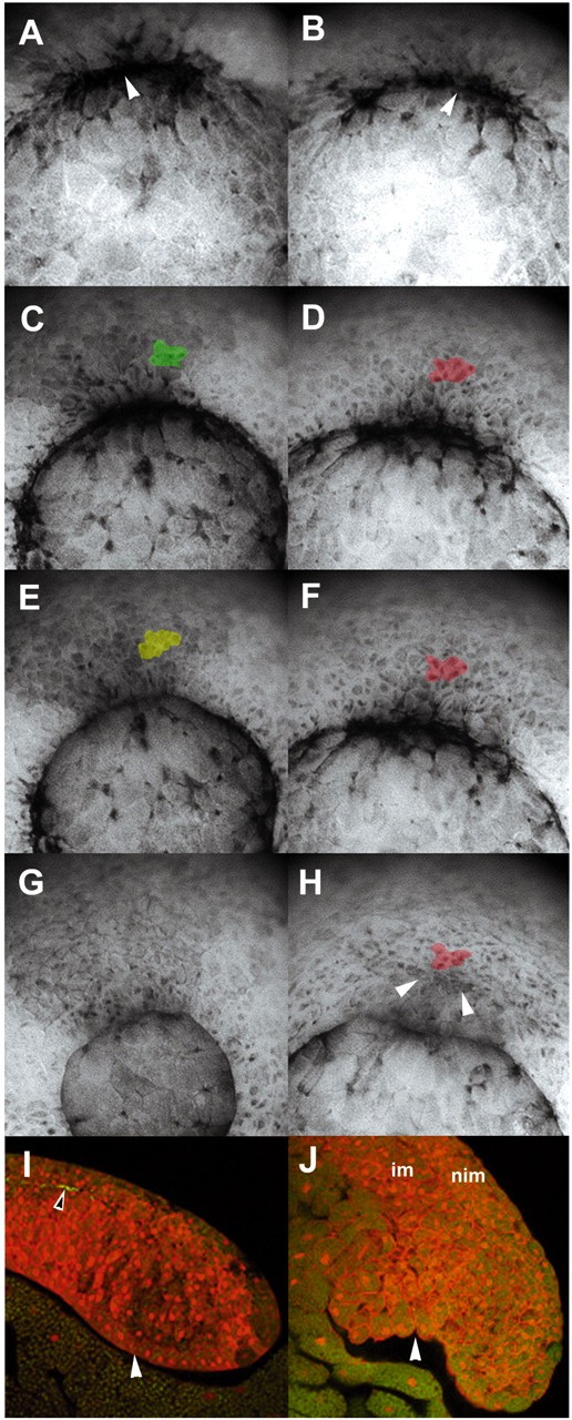 Fig. 6. Timelapse microscopy of dorsal lip movement. (A,C,E,G,I) mAb 4H2-injected control embryos. The blastopore closes normally and there is a progressive involution of superficial DMZ cells over the blastopore lip. (A) Bottle cell formation is normal (arrowhead), and cells marked in green in the DMZ at stage 10.5 (C) before involution over the lip. (E) At stage 11 cells marked in green have passed over the lip to contribute to the lining of the archenteron. A second population of cells marked in yellow also passes through the blastopore as it closes (G). (I) Cross sections through the blastopore lip of stage 12 mAb 4H2-injected embryos reveal involuted superficial cells lining the archenteron (white arrowhead). A FN matrix (black arrowhead) separates the BCR deep cells from the involuted mesoderm. (B,D,F,H,J) Embryos injected with mAb 1F7. In these embryos there is no migration of DMZ cells over the lip of the blastopore during the same time period. (B) Blastopore lip formation is normal (arrowhead). (D,F,H) Cells marked in red remain essentially in the same position in DMZ, and the blastopore remains open through stage 12. Before blastopore closure, the DMZ buckles (arrows H,J). In mAb 1F7-injected embryos, there is no FN matrix evident and the involuted mesoderm (im), as well as the non-involuted tissue (nim) in the DMZ, appears to be disorganized. No archenteron has developed and the short invagination (arrowhead) is the result of DMZ buckling. QuickTime movies of the embryos used to obtain still images for Fig. 6A-H may be viewed on the DeSimone laboratory website (http://faculty.virginia.edu/desimonelab). |
