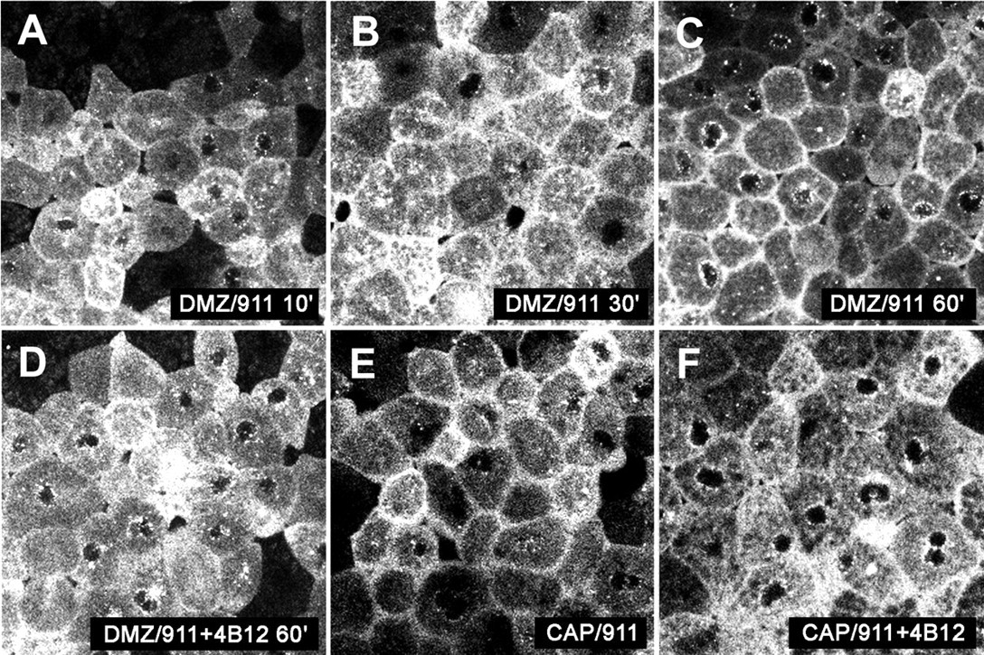 Fig. 12. Timecourse of XDsh-GFP membrane localization. DMZ explants were cultured on GST-9.11 fusion protein substrates. (A) 10 minutes post-plating, XDsh-GFP remained cytoplasmic. (B) After 30 minutes, XDsh-GFP was beginning to accumulate at the cell membrane. (C) 60 minutes after being placed on the substrate, XDsh-GFP was localized to the cell membrane. (D) DMZ explants cultured on GST-9.11 fusion protein pre-incubated with mAb 4B12. XDsh-GFP remained cytoplasmic. (E) When animal caps (CAP) were cultured on GST-9.11 fusion protein, XDsh-GFP was localized to the cell membrane after 60 minutes. (F) The translocation of XDsh-GFP to the cell membrane was blocked after pre-incubation of the substrate with mAb 4B12. |