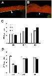 Fig. 9. Intercalative behaviors require β1-containing integrins. Two-cell embryos were injected in one blastomere with either 1 ng HA RNA (control) or the same amount of dominant-negative HAβ1 chimera RNA. (A,C) Expression of HA has no effect upon FN matrix assembly (A; HA in green, FN fibrils in red, overlap in yellow) or on BCR thickness (C; HA shown in green, dextran for contrast is red). (B,D) Expression of the HAβ1 construct results in reduced FN fibril assembly (B; HA in green, FN fibrils in red; faint green cells under fibrils are in the superficial layer), and causes an increase in roof thickness (D; HAβ1 shown in green, dextran for contrast in red). |