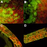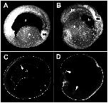 Fig. 11. FN is permissive for XDsh relocalization in the BCR. Embryos were injected with 50 pg of XDsh-GFP RNA. Stage 10 explanted tissue was placed on FN or BSA substrates and examined by confocal microscopy. (A) DMZ tissue placed on BSA shows a granular cytoplasmic localization of XDsh-GFP after 60 minutes. (B) DMZ tissue placed on FN. XDsh-GFP is localized to the cell membrane after 60 minutes. (C) DMZ on the HepII-GST fusion protein. XDsh remains cytoplasmic after 60 minutes. (D) DMZ on poly-L-lysine. XDsh-GFP remains cytoplasmic after 60 minutes. |