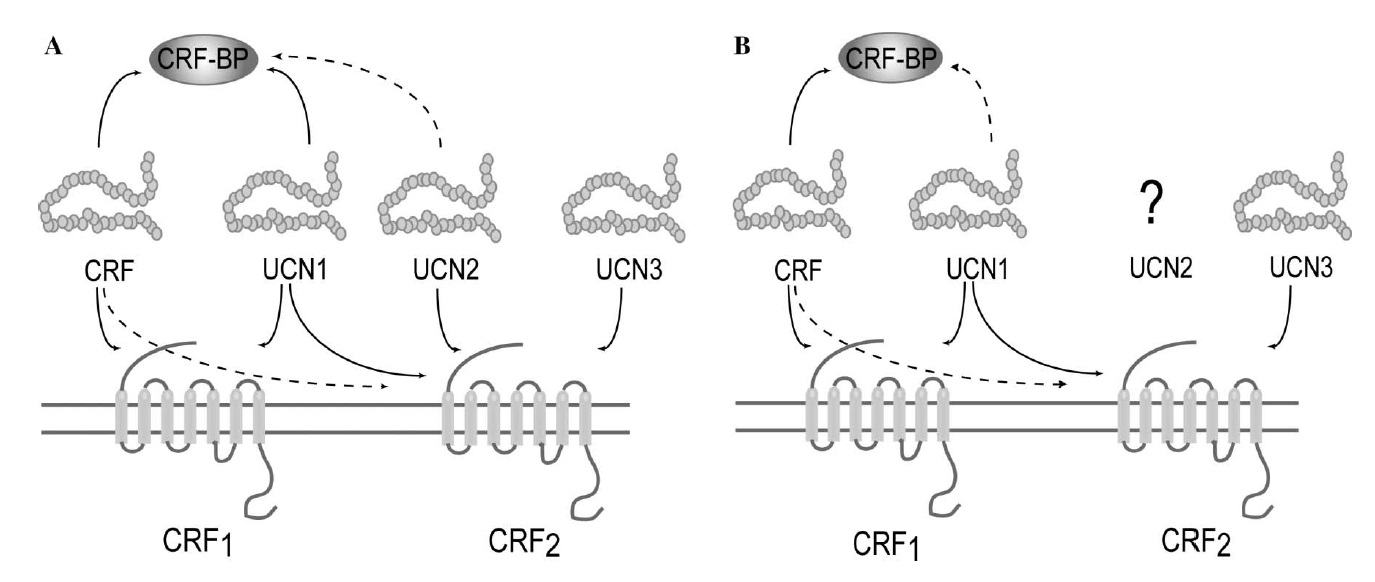 their receptors (CRF1 and CRF2), and the CRF binding protein (CRF-BP). The question mark indicates that a urocortin 2 gene has not yet been