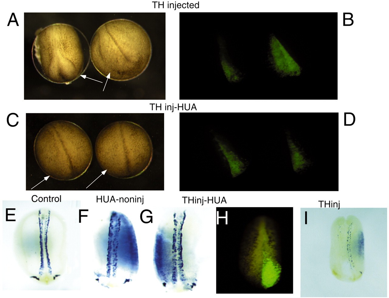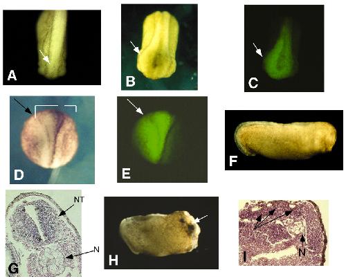 Fig. 7. The TH phenotype is due to proliferation of cells. Embryos injected with TH mRNA were raised until stage 10.5. At that time one group was treated with HUA to inhibit cell proliferation while the control group was not treated. (A,B) Control embryos showing the distribution of GFP (B) and the abnormally large neural folds (A, arrows). (C,D) Treated embryos showing that by inhibiting cell proliferation the enlarged neural folds were reduced to normal size (arrows). (E) Non-injected embryo analyzed by in situ hybridization for N-tubulin. (F) Non-injected embryo treated with HUA and analyzed by in situ hybridization for the expression of N-tubulin. (G) N-tubulin expression in an embryo injected with TH and treated with HUA showing rescue of molecular phenotype. (H) Analysis of GFP in embryo shown in G. (I) TH-injected embryo analyzed for N-tubulin expression showing inhibition without HUA treatment. |