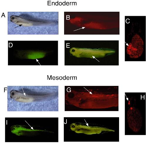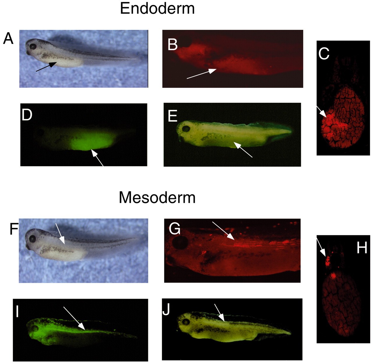 Fig. 5. Effect of TH overexpression on the endoderm and mesoderm. (A-E) Embryos that were injected at the four-cell stage with TH RNA into blastomeres giving rise to the endoderm. (A) Embryo in which TH was overexpressed in the endoderm in which we did not detect any abnormalities in endodermally derived structures. (B) The same embryo showing the rhodamine dextran lineage tracer co-injected with the TH mRNA. (C) Section of the embryo in A and B showing the rhodamine dextran and the normal nature of the endodermal cells (arrow) overexpressing TH. Arrows in A and B indicate the approximate position of the section in C. Arrow in C indicates to the endodermal cells. (D,E) Embryo injected with a mixture of TH and GFP mRNAs at the four-cell stage. (D) The distribution of the GFP. (E) A light microscopy image showing that the endodermal region of the tadpole appears normal. The arrows in D,E point to the region overexpressing the GFP and TH. (F-J) The effect of overexpressing TH in mesoderm. (F-H) The same embryo co-injected with TH mRNA and rhodamine dextran at the four-cell stage into a blastomere giving rise to the mesoderm. (F) Light microscopy image. (G) The distribution of the lineage tracer, rhodamine dextran in the axial muscle. (H) A section of the same embryo. The arrows indicate the same position in the tadpole in each panel. (I,J) A tadpole in which GFP and TH mRNAs were co-injected into the four-cell stage embryo. The TH is overexpressed in the notochord. In both instances there were no abnormalities detected within the mesodermally derived tissues, which were overexpressing TH. |