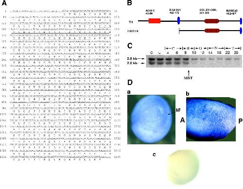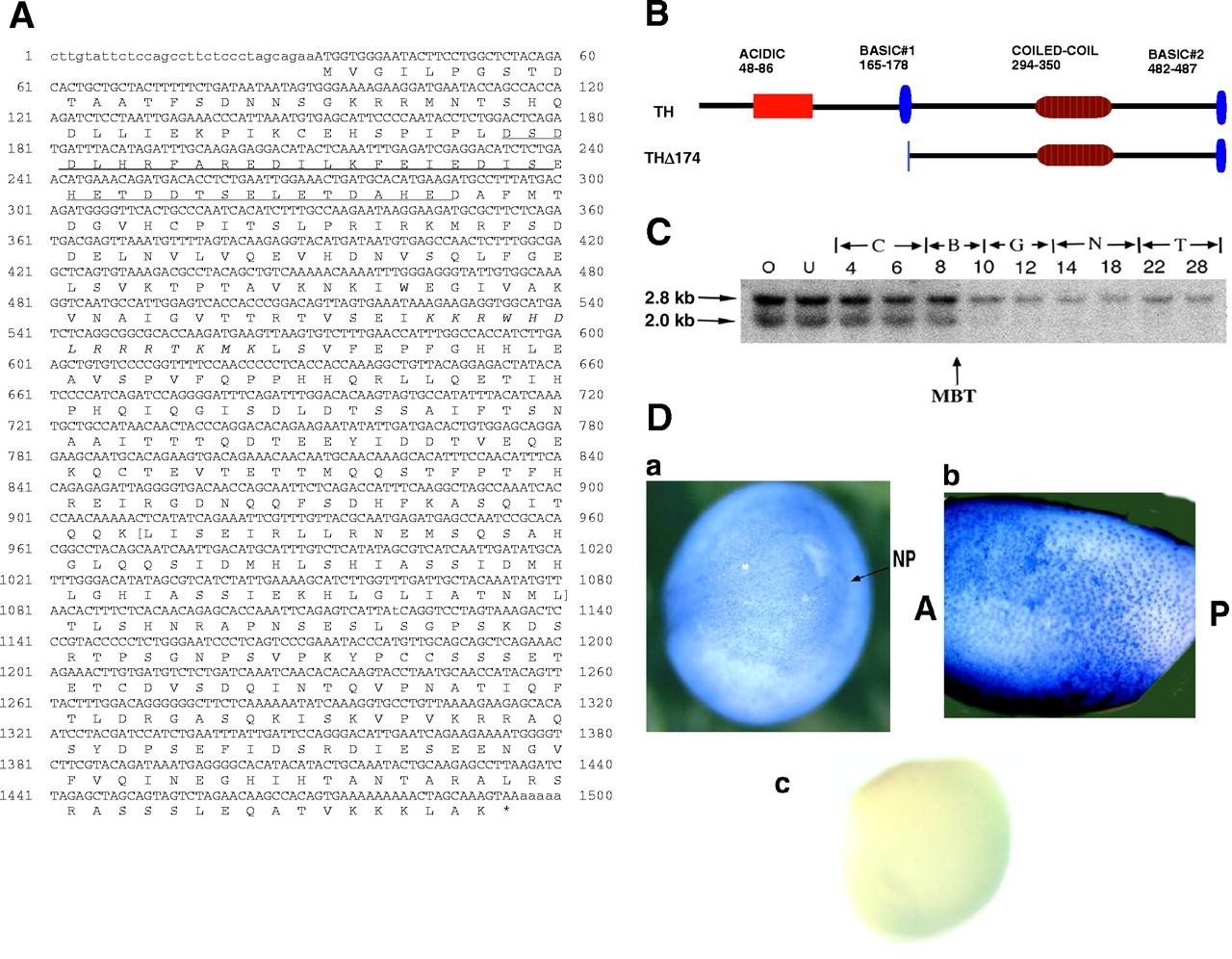 Fig. 1. TH sequence, domains and expression. (A) Nucleotide sequence and translation of TH open reading frame and short stretches of the 3â² and 5â² UTR of the TH cDNA. The domain structure of TH, showing presence of N-terminal acidic domain (amino acids 48-86, underline); basic domain 1 (amino acids 165-178, italics); coiled-coil domain (amino acids 294-350, brackets); basic 2 domain (amino acids 482-487). The asterisk indicates the stop codon. (B) Constructs used in the overexpression experiments. Construct Ïηδ174 consists of a deletion of the N-terminal 174 amino acids, removing the acidic domain and 10 amino acids of the basic domain. (C) Northern blot of TH mRNA from different developmental stages. Total mRNA (6 μg) was loaded into each lane and probed with TH. Dumont stages (Dumont, 1972) are shown at the top of each lane as well as stage designations. B, blastula; C, cleavage; G, gastrula; MBT, midblastula transition; N, neurula; T, tailbud. (D) Immunostaining of stage 17 (a) and stage 23 (b) embryos with anti-TH antibody. (c) A control embryo stained with the TH preimmune serum. A and P represent anterior and posterior; NP is the neural plate. |