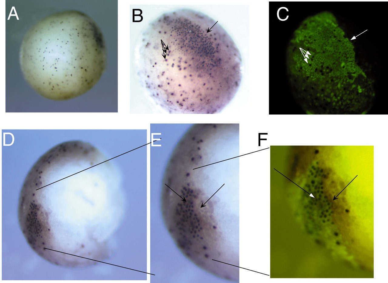 Fig. 6. Overexpression of TH increases cell proliferation. Embryos were injected with Myc-tagged TH mRNA into one blastomere of the four-cell stage embryo. Stage 14 embryos were immunostained with an antibody against phosphorylated histone H3 to detect mitotic cells. (A) Control embryo showing the normal distribution of mitotic cells. (B) Stage 14 treated embryo showing a distinct patch of mitotic cells in one region of the embryo. (C) The same embryo as in B immunostained with the Myc tag antibody to detect the distribution of exogenous TH protein. The arrows on the left point to H3 positive nuclei as landmarks. The arrow on the right points to the border of the TH-expressing cells, which coincides with the border of the mitotically active cells. (D-F) The same embryo as in B, dissected to show the coincident expression of TH with the mitotically active cells. (D) Light microscopy view of the dissected embryo. (E) A higher magnification view. (F) The embryo viewed under u.v. light to detect the fluorescein labeled Myc-tagged TH protein and partial light to visualize the distribution of the H3-positive nuclei. The white arrow points to the area showing of both the TH protein (green) and the H3-positive nuclei. The black arrow points to the region not expressing TH and not showing the H3-positive marker. These cells are all of the same germ layer. |