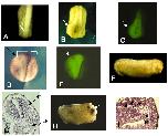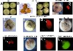 Fig. 8 Loss-of-function analysis of TH. (A) Non-injected stage 9 embryos. (B,C) Stage 7 and stage 9 embryos, respectively, injected with the anti-TH antibodies and rhodamine-derived dextran at the four-cell stage. This was photographed under both u.v. and incandescent light to show the presence of the rhodamine in injected blastomeres (arrows). (D) On the left is a stage 9 embryo injected with heat-inactivated anti-TH antibody. On the right co-injected rhodamine dextran (arrows) shows the location of the injected antibody. (E) Stage 8 embryo injected with anti-TH antibody at the 16 cell stage. The arrow indicates the enlarged blastomeres. (F) Stage 8 embryo injected with a mixture of the anti-TH antibody and purified TH protein. (G) u.v. microscopy image of the same embryo as in F, showing the distribution of the injected mixture (arrows). (H,I) Stage 8 embryo injected with anti-TH antibody at the 16-cell stage showing large blastomeres (arrow in H) and showing location of the antibody (arrow in I). (J,K,L) Stage 8 anti-TH antibody injected embryo rescued by injection of TH mRNA showing normal size blastomeres (arrow in J) in area where the TH mRNA was injected. (K) Distribution of the anti-TH antibody in the embryo, as indicated by rhodamine-conjugated dextran. (L) Distribution of TH mRNA, as indicated by presence of GFP in embryo. The cells in which there is less TH mRNA (arrow) appear larger than those receiving larger amounts of the mRNA. |