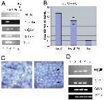 Fig. 4. Effect of TH on expression of neural markers in animal caps. (A) RT-PCR analysis of RNA isolated from animal caps overexpressing NeuroD (lane 3) showing induction of neural markers NCAM, Xath-3 and Xsnail (Xsna). TH alone did not induce any neural markers (lane 4); Co-injection of both NeuroD mRNA and TH mRNA resulted in an inhibition of the differentiated and neural crest markers, Xath-3 and Xsnail, respectively, but did not inhibit the pan-neural marker NCAM (lane 5). Lane 1 is an RT-negative control, while lane 2 is a control lane of embryo RNA. (B) Quantitative RT-PCR showing the levels of NCAM mRNA expression in NeuroD-, and NeuroD- and TH-injected animal caps. N-st are non-injected caps. (C) Animal caps that were immunostained with anti-TH antibody. The panel on the left shows control animal caps; the panel on the right shows animal caps from embryos injected with NeuroD mRNA at the four- to eight-cell stage. Black arrows indicate the cell periphery; white arrows, nuclei. (D) The effect of TH on animal caps induced with activin. Animal caps from embryos that were injected with TH mRNA into the animal blastomeres or uninjected embryos were dissected at stage 8 and treated with activin. Lane 1 is an RT-negative control; lane 2 contains RNA from embryos as a positive control; lane 3 contains RNA from animal caps treated with activin; lane 4 contains RNA from embryos overexpressing TH and treated with activin; lane 5 contains RNA from control untreated animal caps. |