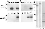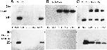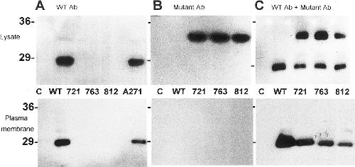 Figure 5. Immunoblot of the oocyte lysates and plasma-membrane fractions probed with an affinity-purified antibody (Ab) against wild-type or mutant AQP2. Oocytes were injected with water (C) or with 5 ng cRNA of wild-type (WT) or mutant AQP2s (“721” denoes 721delG; “763” denotes 763–772del; “812” denotes 812–818del; and “A271” denotes A271del). The lysates from the equivalent of one-fifth of an oocyte (upper panels) or the membranes from the equivalent of 20 oocytes (lower panels) were loaded in each lane. The protein expression was detected with an anti–wild-type-AQP2 antibody (A), an anti–mutant AQP2 antibody (B), or a mixture of both (C).