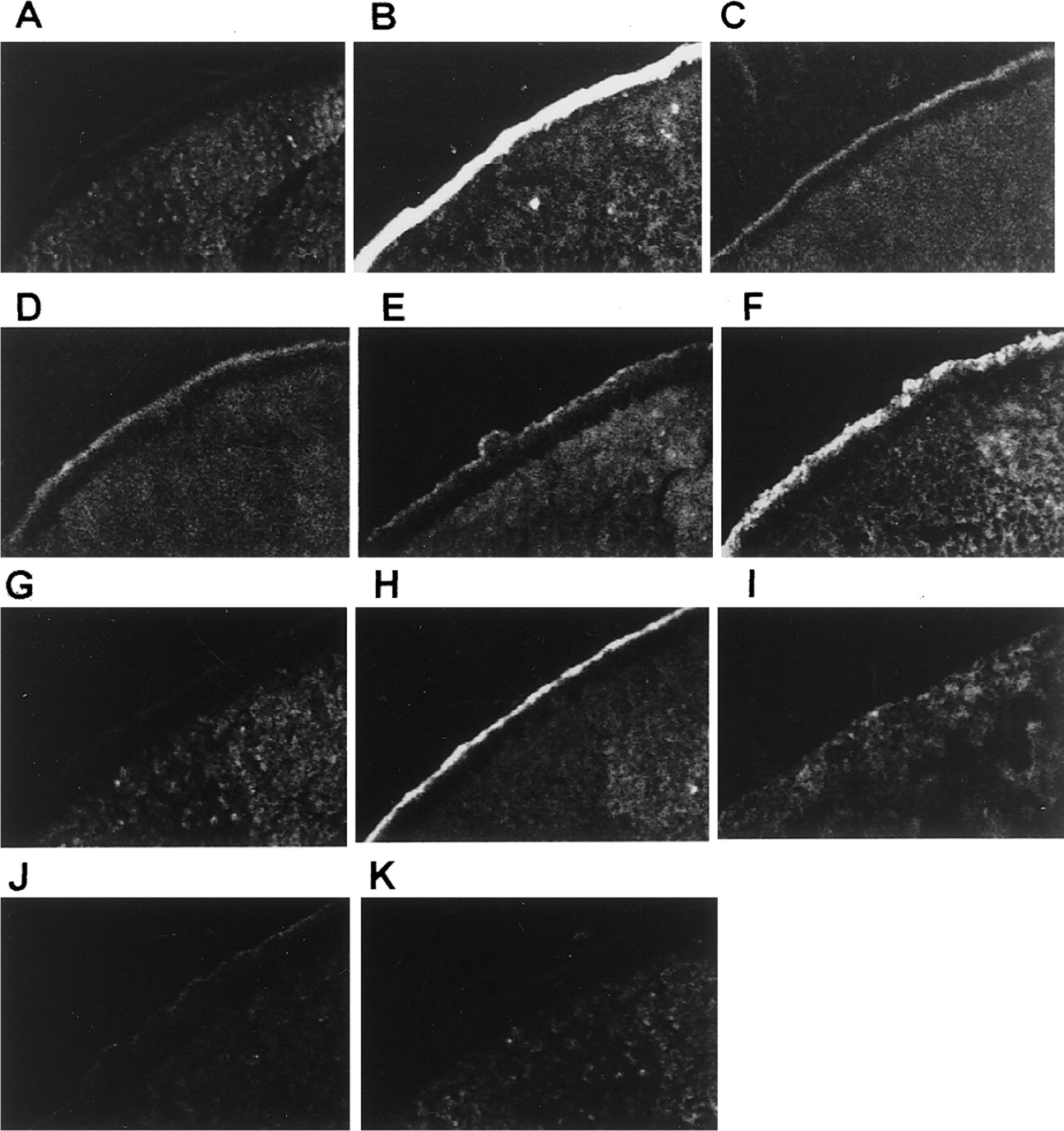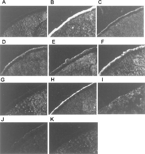 Figure 6. Immunocytochemistry of oocytes injected with cRNA encoding the wild-type or mutant AQP2s. Oocyte sections were incubated with an affinity-purified antibody against the wild-type or mutant AQP2 and immunostained with goat anti-rabbit IgG conjugated with FITC. The sections were viewed with a confocal microscope at 400× magnification. A and B, Water-injected oocyte (A) and oocyte injected with 5 ng of the wild-type cRNA (B), probed with an anti–wild-type AQP2 antibody. C–E, Oocyte injected with 5 ng cRNA of 721delG (C), 763–772del (D), or 812–818del (E), detected with an anti–mutant AQP2 antibody. F–G, Oocyte coinjected with 5 ng each of cRNA of the wild-type and 721delG mutant incubated with an anti–wild-type AQP2 antibody (F) or an anti–mutant AQP2 antibody (G). H–K, Oocyte injected with 0.3 ng cRNA of the wild-type (H) or coinjected with 0.3 ng each of cRNA of the wild-type and one of 721delG (I), 763–772del (J), or 812–818del (K), incubated with an antibody against the wild-type AQP2.