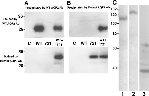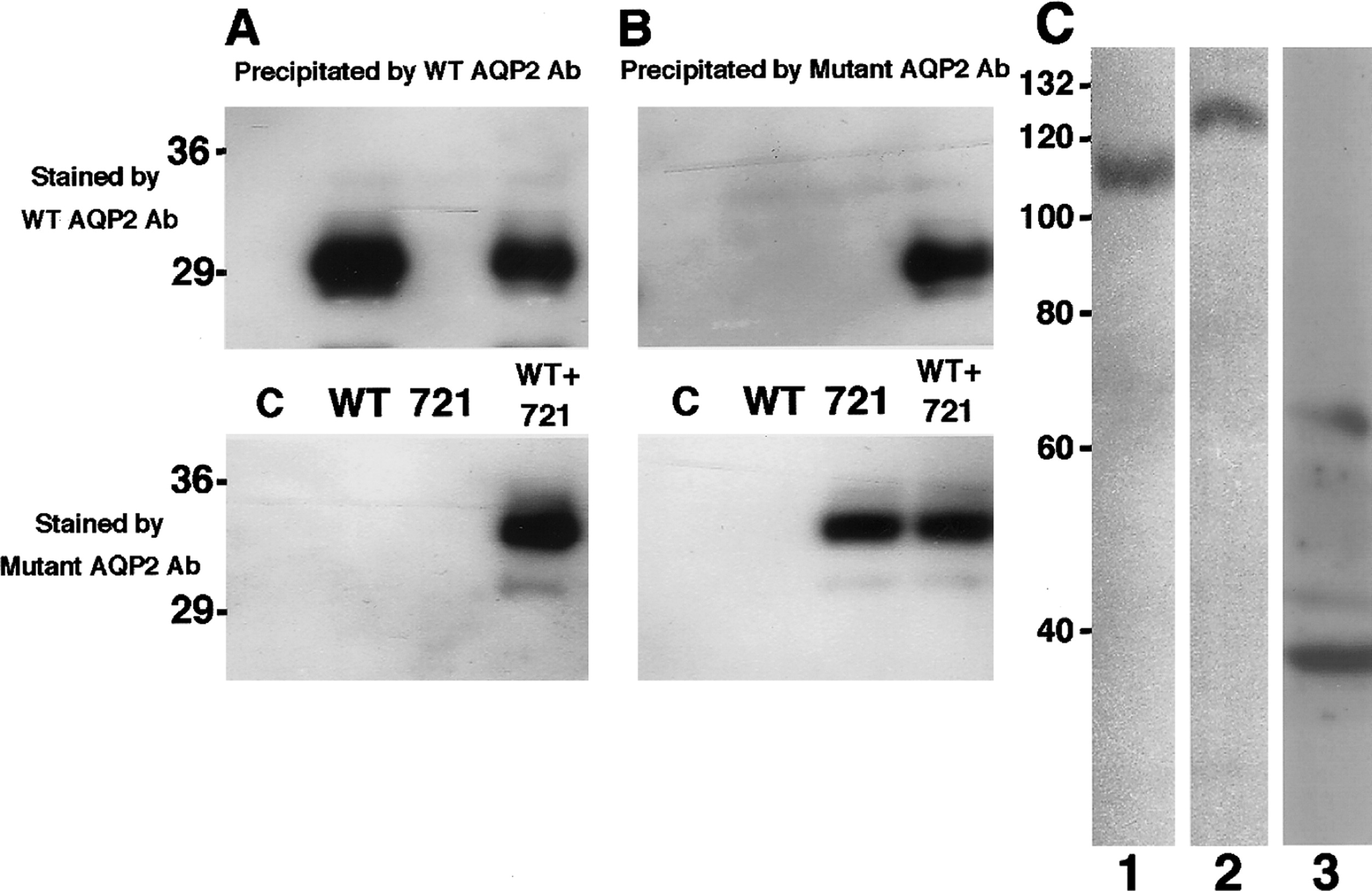 Figure 7. Oligomeric states of the wild-type and mutant AQP2 proteins. A, Immunoprecipitation of oocyte membrane fractions injected with water (C) or cRNA of the wild-type AQP2 (WT), 721delG (721), or both (WT + 721). Samples were immunoprecipitated with a wild-type AQP2 antibody (Ab) and were immunoblotted with the same antibody (upper panel) or with an antibody against mutant AQP2 (lower panel). B, Samples were immunoprecipitated with an antibody to the mutant AQP2 and were immunoblotted with an antibody to the wild-type AQP2 (upper panel) or the mutant AQP2 (lower panel). C, Determination of the oligomeric structure by PFO-PAGE. Membrane samples from 90–100 oocytes expressing the wild-type AQP2 and 721delG mutant were applied in each lane. Lane 1, Wild-type AQP2; lane 2, 721delG; lane 3, 721delG treated with urea. The sample of 721delG was further incubated with 4 M urea for 30 min at room temperature before loading.