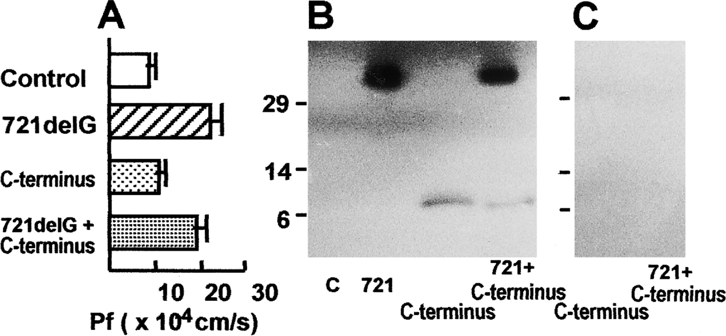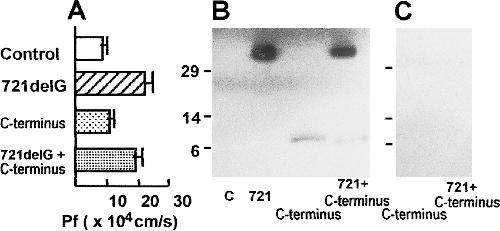 Figure 8. Coexpression of the C-terminal portion of the mutant AQP2 protein with mutant AQP2 protein in oocytes. Five nanograms of cRNAs encoding the portion of the last 61 amino acids (C-terminus), the mutant AQP2 721delG (721), or both, were injected into oocytes. A, Oocyte Pf. Each bar represents the mean ± SE of 17–20 measurements. B and C, Immunoblot of the oocyte lysates (B) and plasma-membrane fractions (C), probed with an antibody against the mutant AQP2.