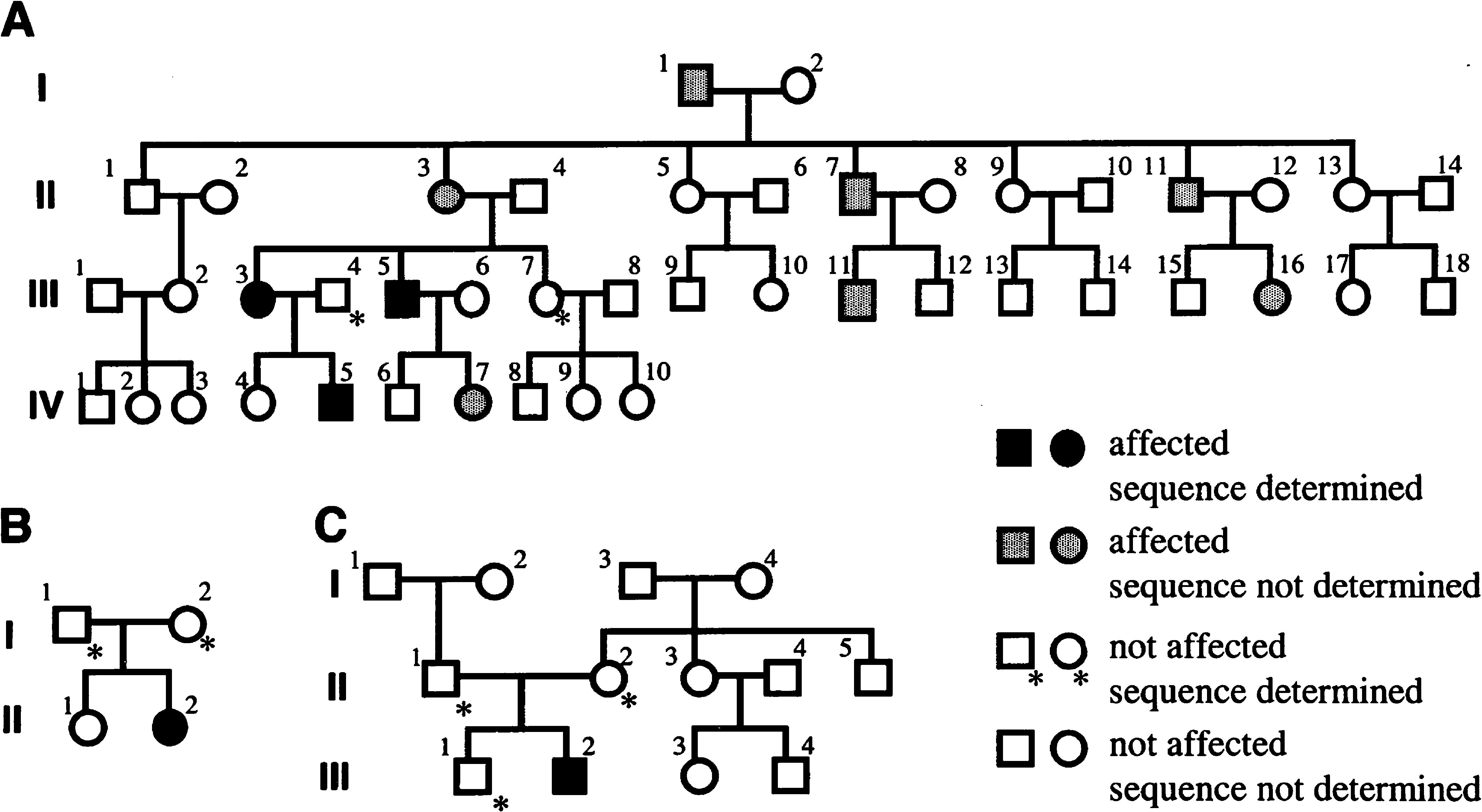 Figure 1. Pedigrees of the three families with NDI. Squares and circles represent males and females, respectively.