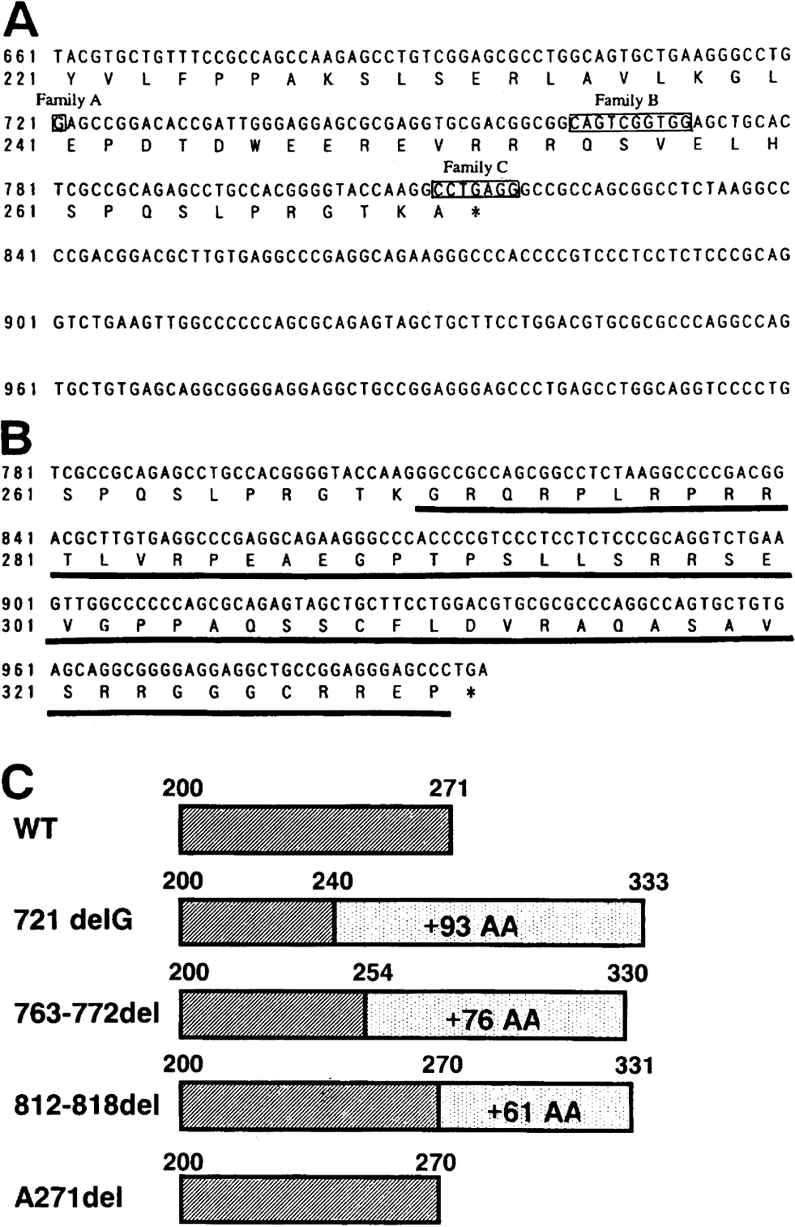 Figure 3. Sequence and structure of the wild-type (WT) and mutant AQP2 cDNAs. Nucleotide and amino acid residue numbers correspond to the cDNA; the A of the initiator Met codon is nucleotide 1. A, Nucleotide and amino acid sequence at the C-terminal site of wild-type AQP2. The boxed bases are the deleted bases detected in patients with NDI who are included in the present study. One, ten, and seven nucleotides were deleted, starting at 721 (721delG), 763 (763–772del), and 812 (812–818del), respectively. B, Sequences of the C-terminus in 812–818del. This mutation shifted the stop codon 180 nucleotides downstream, resulting in an addition of 61 new amino acids (underlined) to the terminal end. C, Schematic structure of mutant AQP2s. The frameshift mutations 721delG, 763–772del, and 812–818del result in the addition of 93, 76 and 61 new amino acids, respectively. Because the number of deleted bases were 3×n+1 (n=0, 2, or 3), 61 C-terminal amino acids are common in these three mutants. All of the three AQP2 mutants lack the last amino acid of the wild-type AQP2 (alanine at codon 271).