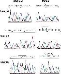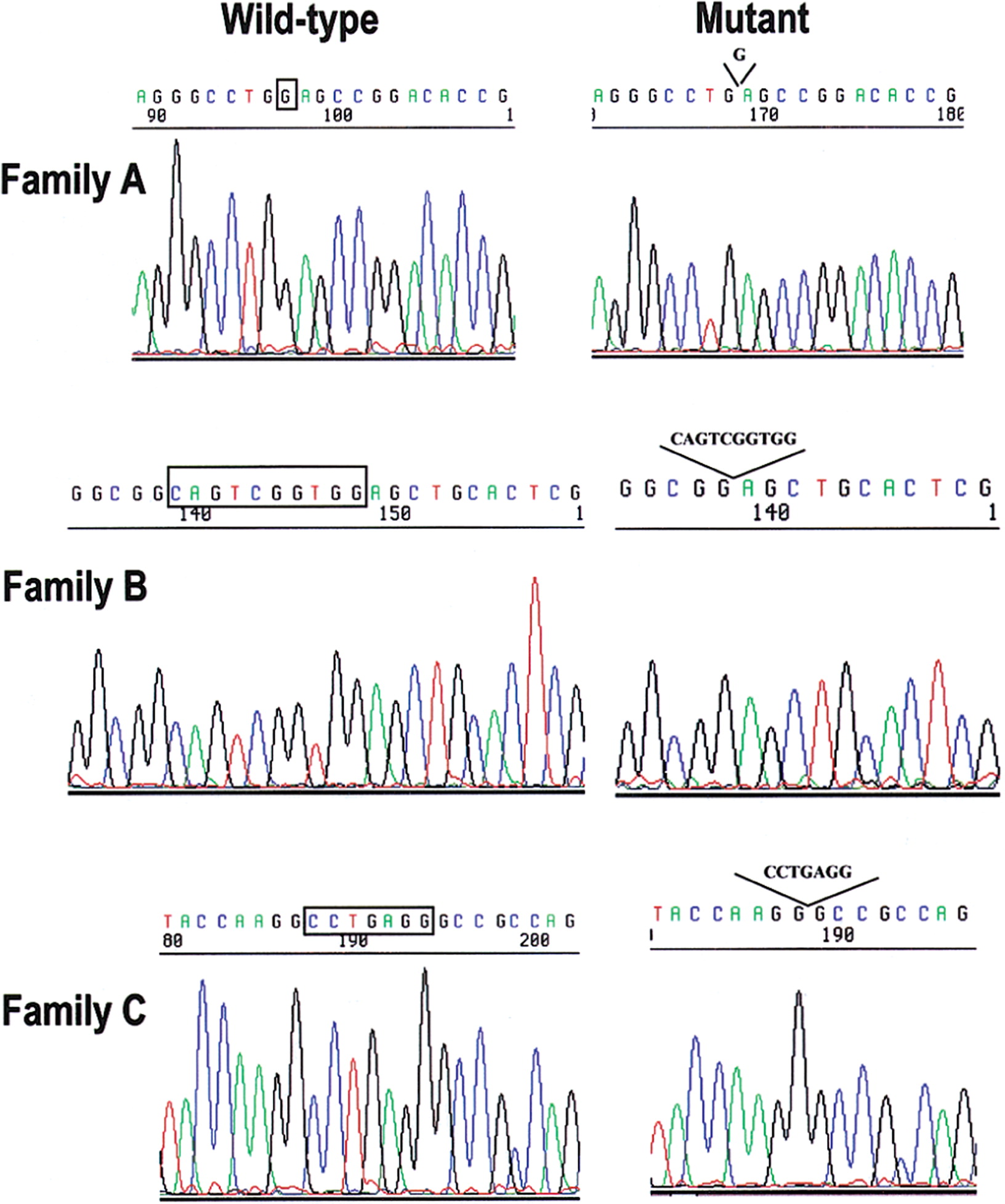 Figure 2. DNA sequencing of the mutated regions of the AQP2 gene found in three families with NDI.