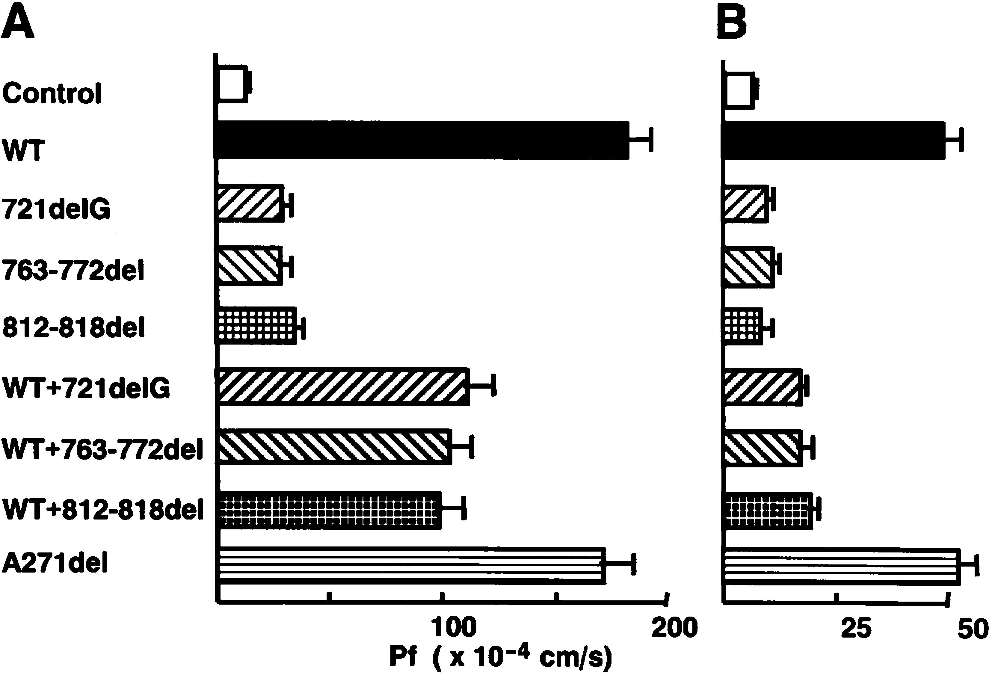 Figure 4. Pf of oocytes expressing wild-type and mutant AQP2s. Oocytes were injected with 40 nl of water (control), or cRNA of the wild-type (WT) or one of the mutant AQP2s (721delG, 763–772del, 812–818del, and A271del). Either 5 ng (A) or 0.3 ng (B) of cRNA was injected. For coexpression, one of the mutated cRNAs was coinjected with the wild-type cRNA. Pf was calculated from the time of osmotic cell swelling of the oocytes. Each bar represents the mean±SE of 21–24 measurements.
