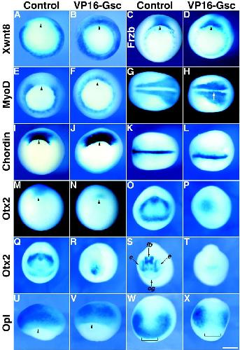 Fig. 8. VP16-Gsc alters gene expression at the gastrula and neurula stages. At the four-cell stage, two dorsal blastomeres were injected with 500 pg of VP16-Gsc. Embryos were fixed at stage 10.5 (early gastrula), 12.5 (late gastrula), 15 (mid-neurula) or 20 (late neurula). Gene expression was detected by in situ hybridization of uninjected (Control) and VP16-Gsc-injected embryos. VP16-Gsc caused an expansion of Xwnt8 (B) and MyoD (F) into the dorsal marginal zone at stage 10.5, and MyoD-positive cells were present at the midline (white arrow) at stage 15 (H). Frzb and Chordin expression in the organizer was not affected at stage 10.5 (D,J) and Chordin expression in the chordamesoderm was normal at stage 15 (L). Otx2 was reduced or absent at all stages examined (N,P,R,T). Opl expression in the prospective neural plate was not affected by VP16-Gsc at stage 10.5 (V), but was absent from the most anterior domain of the neural plate (bracket) at stage 12.5 (X). Black arrowheads indicate the dorsal blastopore lip. The black arrows indicate the primordia of the forebrain (fb), eyes (e) and cement gland (cg) (S). Vegetal views are shown in A-F,I,J,M,N, dorsal view is shown in G,H,K,L,U,V with anterior on the left in G,H,K,L and anterior view is shown in O-T,W,X. Scale bar: 0.5 mm. |