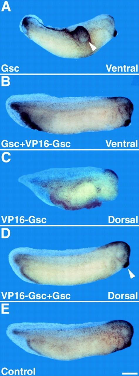 Fig. 2. VP16-Gsc is a specific inhibitor of Gsc function. One ventral (A,B) or two dorsal (C,D) blastomeres were injected at the four-cell stage with 150 pg of Gsc (A), 500 pg of VP16-Gsc (C) or a combination of Gsc and VP16-Gsc (B,D). An uninjected embryo is also shown (E). Arrowheads indicate partial secondary axis (A) or cement gland (D). Scale bar: 0.5 mm. |