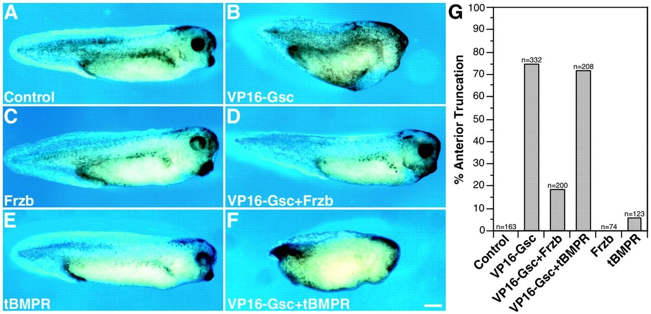 Fig. 3. Ectopic activation of Wnt signaling by VP16-Gsc inhibits head formation. At the four-cell stage two dorsal blastomeres were injected with 500 pg of VP16-Gsc (B), 100 pg of Frzb (C), 150 pg of tBMPR (E), VP16-Gsc and Frzb (D) or VP16-Gsc and tBMPR (F). An uninjected embryo is also shown (A). Quantitation is shown in G. Each bar represents the percentage of embryos with anterior truncations resulting from five independent experiments. n, total number of injected embryos. Scale bar: 0.5 mm. |