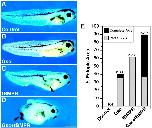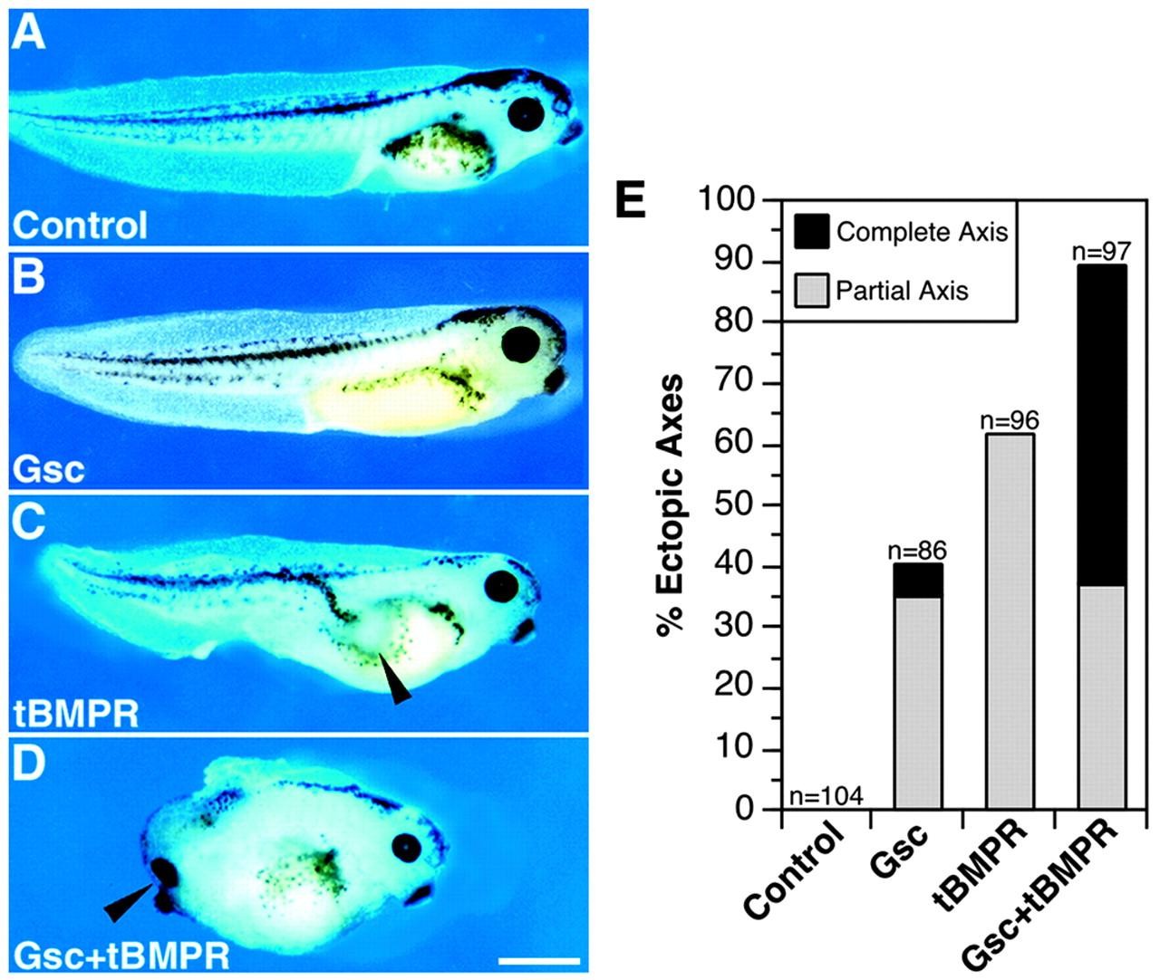 Fig. 7. Complete axis induction by co-expression of Gsc and a truncated BMP receptor. At the four-cell stage, two ventral blastomeres were injected with 100 pg of Gsc (B), 250 pg of a truncated BMPR (tBMPR) (C) or a combination of both (D), and axis induction was assessed at the late tadpole stage. Arrowhead indicates partial axis (C) or ectopic eye in a complete secondary axis (D). Quantitation is shown in E. Each bar represents the percentage of embryos with ectopic axes resulting from four independent experiments. Dark bar, complete secondary axes; light bar, partial secondary axes; n, total number of injected embryos. Scale bar: 1.0 mm. |