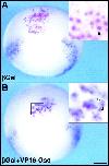 Fig. 5. Cell autonomous activation of Xwnt8 by VP16-Gsc. At the 16-cell stage, one dorsal marginal zone blastomere was injected with 750 pg of β-galactosidase (β-gal) mRNA (A) or a combination of β-gal and 500 pg of VP16-Gsc (B). Descendents of the injected cell were identified at the gastrula stage by the presence of β-gal, using the Rose-gal substrate. Activation of Xwnt8 by VP16-Gsc in the dorsal marginal zone and endogenous ventrolateral expression of Xwnt8 was detected by in situ hybridization with BM-purple substrate (A,B). Dorsal views of stage 10.25 embryos with endogenous Xwnt8 expression visible in lateral regions. Insets show higher magnification views of boxed regions. Black arrowheads indicate β-gal-positive nuclei (red) and the white arrowhead indicates cytoplasmic Xwnt8 in situ stain (purple). Scale bar: 0.25 mm; 80 μm in the insets. |