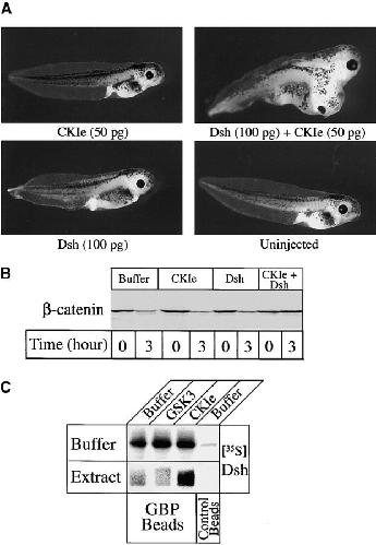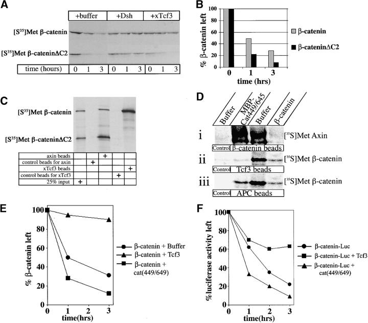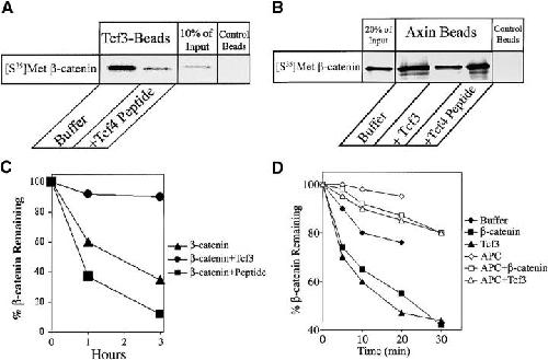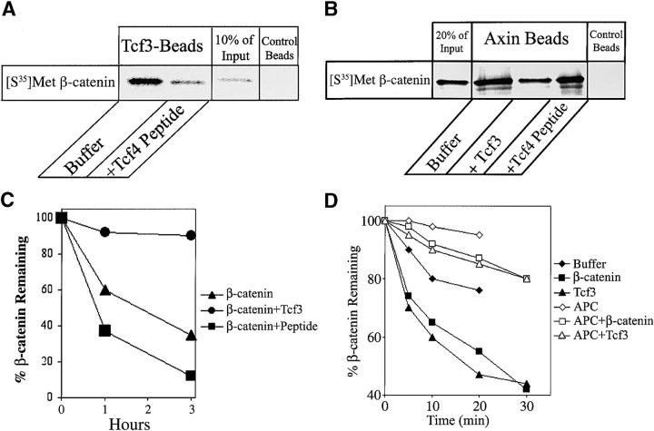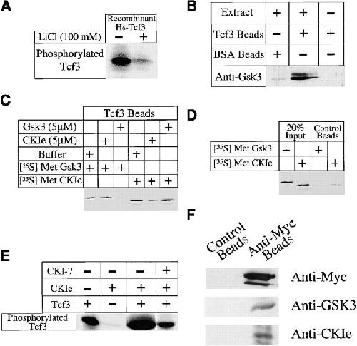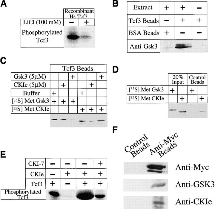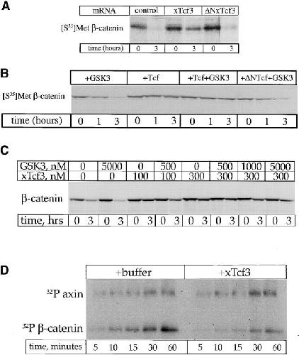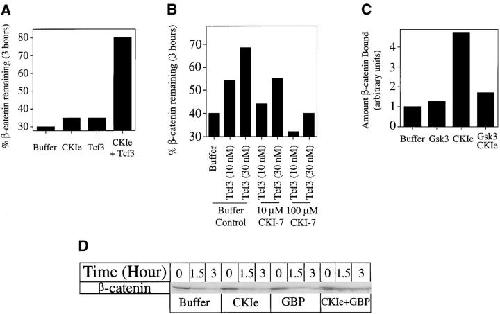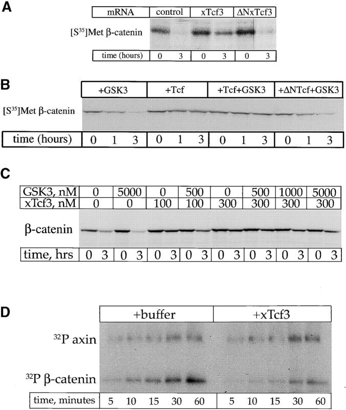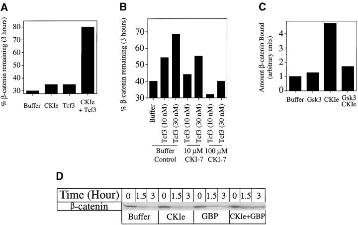 The wnt pathway regulates the steady state level of beta-catenin, a transcriptional coactivator for the Tcf3/Lef1 family of DNA binding proteins. We demonstrate that Tcf3 can inhibit beta-catenin turnover via its competition with axin and adenomatous polyposis for beta-catenin binding. A mutant of beta-catenin that cannot bind Tcf3 is degraded faster than the wild-type protein in Xenopus embryos and extracts. A fragment of beta-catenin and a peptide encoding the NH2 terminus of Tcf4 that block the interaction between beta-catenin and Tcf3 stimulate beta-catenin degradation, indicating this interaction normally plays an important role in regulating beta-catenin turnover. Tcf3 is a substrate for both glycogen synthase kinase (GSK) 3 and casein kinase (CK) 1epsilon, and phosphorylation of Tcf3 by CKIepsilon stimulates its binding to beta-catenin, an effect reversed by GSK3. Tcf3 synergizes with CK1epsilon to inhibit beta-catenin degradation, whereas CKI-7, an inhibitor of CK1epsilon, reduces the inhibitory effect of Tcf3. Finally, we provide evidence that CK1epsilon stimulates the binding of dishevelled (dsh) to GSk3 binding protein (GBP) in extracts. Along with evidence that a significant amount of Tcf protein is nonnuclear, these findings suggest that CK1epsilon can modulate wnt signaling in vivo by regulating both the beta-catenin-Tcf3 and the GBP-dsh interfaces.