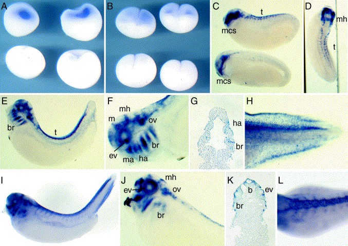 Fig. 2. Localization of XDan expression by whole-mount in situ hybridization. Except in (A,B,I,L) embryos were cleared with benzyl benzoate/benzyl alcohol. (A,B) Localization of maternal XDan transcripts (in each panel the top pair was probed for XDan while the bottom pair was probed with a sense control to access background staining). (A) Maternal XDan transcripts in stage VI oocytes. (B) Maternal transcripts in stage 3 embryos. (C) Lateral view of stage 25 embryos. (D) Dorsal view of stage 25 embryos. (E) Lateral view of stage 30 embryos. (F) Close up of stage 30 embryo showing XDan expression in derivatives of the cranial neural crest. (G) Horizontal section through the head and foregut of stage 30 embryo. Note that XDan expression is apparent in both superficial and underlying levels of the mandibular, hyoid, and branchial arches. (H) XDan expression in the finmesenchyme of stage 38 embryo. (I) Lateral view of XDan expression in uncleared stage 38 embryo illustrating weak expression in the chevron-shaped ventral migration pathways of trunk neural crest. (J) Lateral view of XDan expression in the head of stage 38 embryo. (K) Horizontal section passing directly through the eye of a stage 38 embryo. (L) Dorsal view of stage 38 trunk. b, Brain; br, branchial arches; ev, eye vesicle; ha, hyoid arch; m, midbrain; ma, mandibular arch; mcs, mandibular crest segment; mh, midbrainâhindbrain boundary; ov, otic vesicle; t, trunk neural crest.