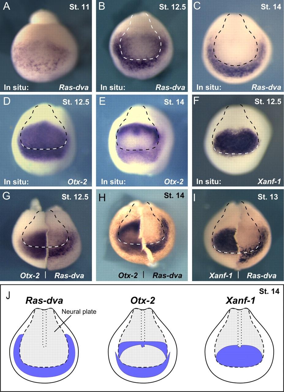 Ras-like small GTPases are involved in the regulation of many processes essential for the specification of the vertebrate body plan. Recently, we identified the gene of novel small GTPase Ras-dva, which is specifically expressed at the anterior margin of the neural plate of the Xenopus laevis embryo. Now, we demonstrate that Ras-dva and its homologs in other species constitute a novel protein family, distinct from the previously known families of small GTPases. We show that the expression of Ras-dva begins during gastrulation throughout the anterior ectoderm and is activated by the homeodomain transcription factor Otx2; however, later on, Ras-dva expression is inhibited in the anterior neural plate by another homeodomain factor Xanf1. Downregulation of Ras-dva functioning by the dominant-negative mutant or by the antisense morpholino oligonucleotides results in severe malformations of the forebrain and derivatives of the cranial placodes. Importantly, although the observed abnormalities can be rescued by co-injection of the Ras-dva mRNA, they cannot be rescued by the mRNA of the closest Ras-dva homolog from another family of small GTPases, Ras. This fact indicates functional specificity of the Ras-dva signaling pathway. At the molecular level, downregulation of Ras-dva inhibits the expression of several regulators of the anterior neural plate and folds patterning, such as Otx2, BF-1 (also known as Foxg1), Xag2, Pax6, Slug and Sox9, and interferes with FGF8 signaling within the anterior ectoderm. By contrast, expression of the epidermal regulator BMP4 and its target genes, Vent1, Vent2b and Msx1, is upregulated. Together, the data obtained indicate that Ras-dva is an essential component of the signaling network that patterns the early anterior neural plate and the adjacent ectoderm in the Xenopus laevis embryos.