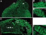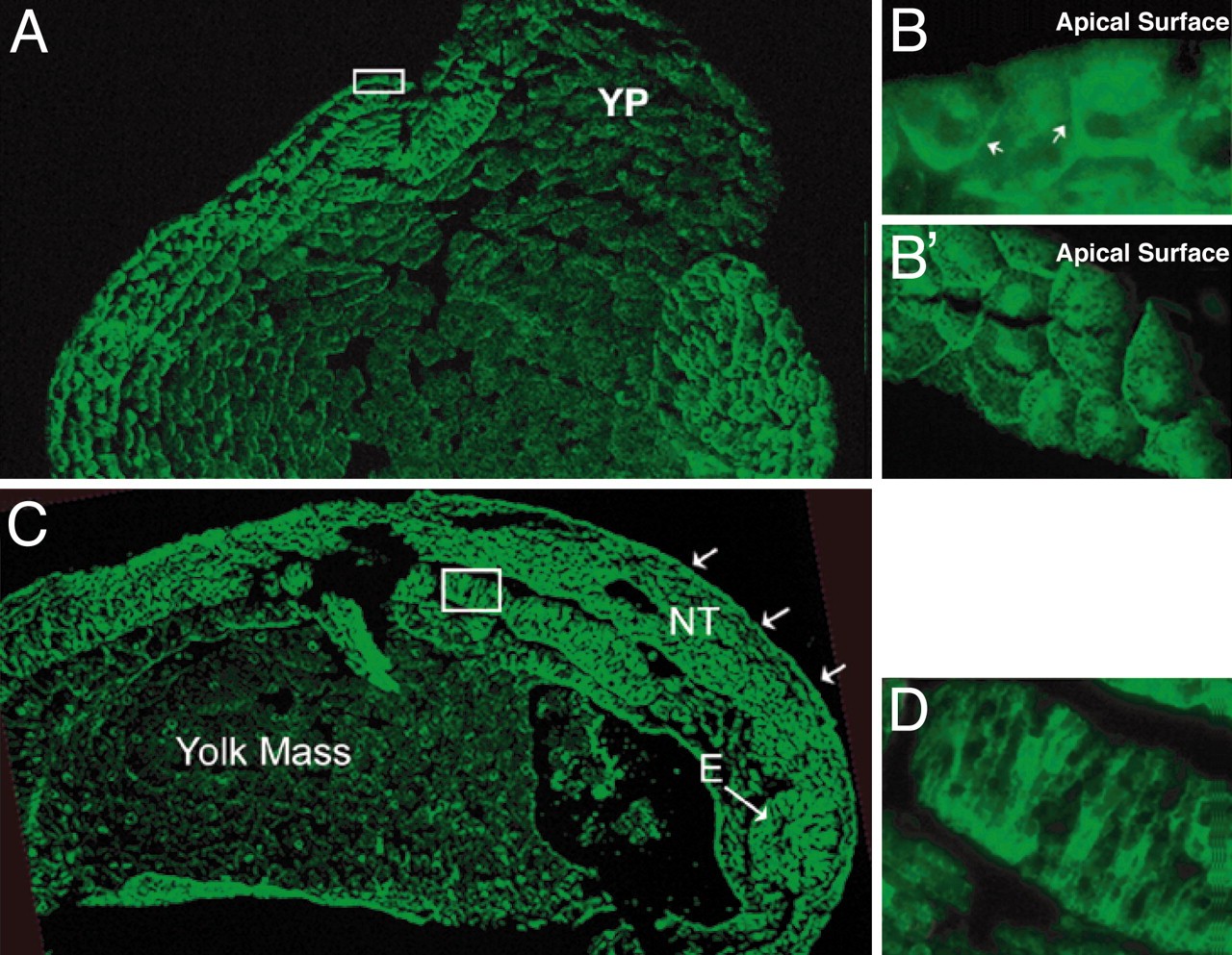 Fig. 2. Immunohistochemical analysis of Xbves expression in early embryos. (A) At stage 11.5, anti-Xbves (green) reacts with surface and involuted cells but is negative for endodermal cells of the yolk plug (YP). (B) High power view of region outlined by the box in A. Arrows show that Xbves is confined to regions of cell/cell contact and is missing from the apical regions of the cell. (Bâ²) High power view of stage 8 embryos shows similar distribution of Xbves protein. (C) Anti-Xbves reacts with ectodermal and mesodermal tissues of the stage 19 embryo. The neural tube (NT), eye (E), and surface ectoderm (arrows) are specific epithelial structures labeled by this serum. The white box, magnified in C, shows staining of the notochord. (D) Xbves expression is detected at the cell surface of mesodermally derived notochord.