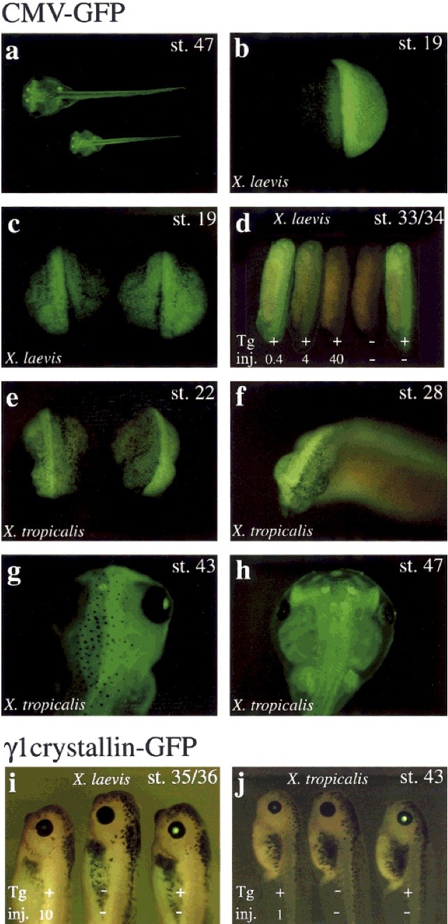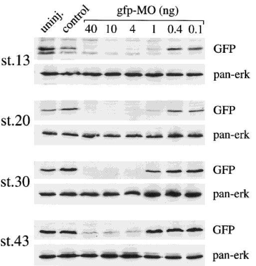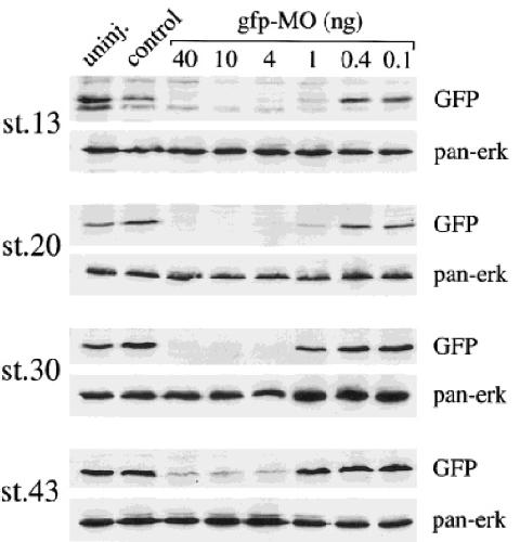 Morpholino (MO) based inhibition of translational initiation represents an attractive methodology to eliminate gene function during Xenopus development (Heasman et al., 2000). However, the degree to which a given target protein can be eliminated and the longevity of this effect during embryogenesis has not been documented. To examine the efficacy of MOs, we have used transgenic Xenopus lines that harbour known numbers of integrations of a GFP reporter under the control of the ubiquitous and highly expressed CMV promoter (Fig. 1a). In addition we have investigated the longevity of the inhibitory effect by using transgenic lines expressing GFP specifically in the lens of tadpoles. These transgenic lines represent the ideal control for the technique as the promoters are highly expressed and GFP can be easily detected by fluorescence and immunoblotting. Moreover, as GFP has no function in development, the levels of inhibition can be tested in an otherwise normal individual. Here we report that MOs are able to efficiently and specifically inhibit the translation of GFP in transgenic lines from Xenopus laevis and Xenopus tropicalis and the inhibitory effect is long-lived, lasting into the tadpole stages. genesis 30:110--113, 2001.