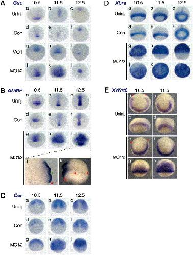 Fig. 4. Xatv is essential for normal organizer and mesoderm formation during gastrulation. 1-cell stage embryos received 60 ng of control MO, XatvMO1, or 30 ng each (XatvMO1 + XatvMO2), and were assayed by in situ hybridization at the stages indicated. (A) Gsc expression. (a–l) Dorsal views. [Quantitative analysis of alterations shown: g, n = 9/9; h, n = 13/14; i, n = 9/9; j, n = 12/18; k, n = 13/14; l, n = 15/15.] Note the stronger and more expanded Gsc expression in XatvMO1 + MO2-injected embryos than in XatvMO1-injected embryos. (B) ADMP expression. (a–i) Dorsal views [Quantitation: g, n = 11/16; h, n = 15/17; i, n = 14/16.] (j, k) XatvMO1 + MO2-injected embryo at St. 12.5 was bisected through the center of ADMP expression domain along the animal–vegetal axis after in situ hybridization; lateral views are (j) internal or (k) external (green arrowheads, indentation of the superficial layer; red arrowheads, epiboly margin). (C) Cer expression. (a, d, g) Vegetal views. (b, c, e, f, h, i) Dorsal views. [Quantitation: g, n = 5/6; h, n = 7/7; i, n = 6/7.] (D) Xbra expression. (a–i) Lateral views, except panels c and f (vegetal views). (j–l) Animal views. [Quantitation: j, n = 14/15; k, n = 16/17; l, n = 15/17.] Xbra expression is massively expanded in XatvMO1 + MO2-injected embryos during gastrulation. (E) XWnt8 expression. (a, b, e, f): Vegetal views, (c, d, g, h): Same embryos viewed ventrally. [Quantitation: e, n = 13/19; f, n = 11/15.] Red arrowheads show the arc of XWnt8 non-expressing dorsal region. |