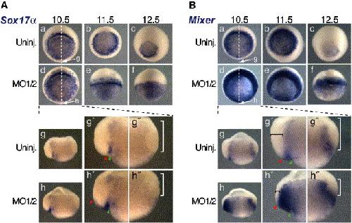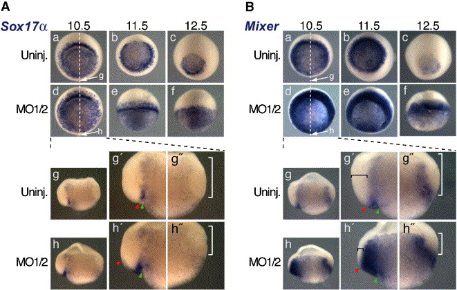Fig. 5. Xatv is required for normal endoderm fate specification. (A) In situ hybridization with Sox17α in uninjected and XatvMO1 + MO2-injected embryos during gastrulation. (a–c) Uninjected embryos. (d–f) XatvMO1 + MO2-injected embryos. (a–d) Vegetal view, dorsal upwards. [Quantitative analysis of alterations shown: d, n = 6/6.] (e, f) Lateral view. [Quantitation: e, n = 8/8; f, n = 9/10.] (g, h) Sox17α expression at St. 10.5 detected by in situ hybridization after bisection through the center of the dorsal lip of (g) uninjected (n = 10/10) and (h) XatvMO1 + MO2-injected (n = 9/10) embryos (dorsal to the left). (g′, h′) Magnified views, dorsal side of panels g and h, compared to (g′′, h′′) magnified ventral side views. (B) Mixer expression in (a–c) uninjected and (d–f) XatvMO1 + MO2-injected embryos during gastrulation. (a–e) Vegetal view, dorsal to the top. [Quantitation: d, n = 6/6; e, n = 8/8.] (f) Lateral view (n = 8/8). (g, h) Mixer expression at St. 10.5 detected by in situ hybridization after bisection through the center of the dorsal lip of (g) uninjected (n = 8/8) and (h) XatvMO1 + MO2-injected (n = 10/10) embryos (dorsal to the left). (g′, h′) Magnified views, dorsal side of g and h compared to (g′′, h′′) magnified ventral views. Green arrowheads: dorsal lip. Red arrowheads: most animal/anterior expression limit of Sox17α (A) and Mixer (B). White brackets: separation of blastocoel floor from the edge of Sox17α (A) and Mixer (B) expression domains in the superficial layer. Black brackets: breadth of Mixer-negative area in the dorsal mesoderm region (B: g′, h′). |